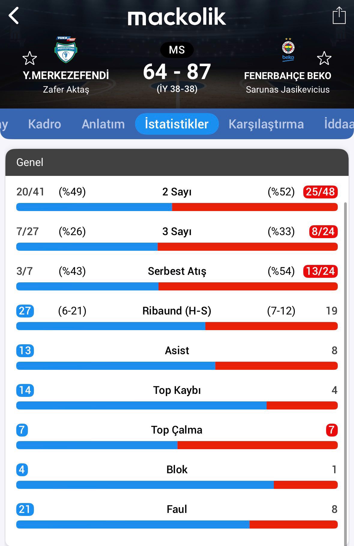 Bu sonuçla ligde yalnızca 1 mağlubiyeti bulunan Fenerbahçe Beko, averajla liderliğini sürdürdü. Y. Merkezefendi ise sezonun 6. yenilgisini aldı.