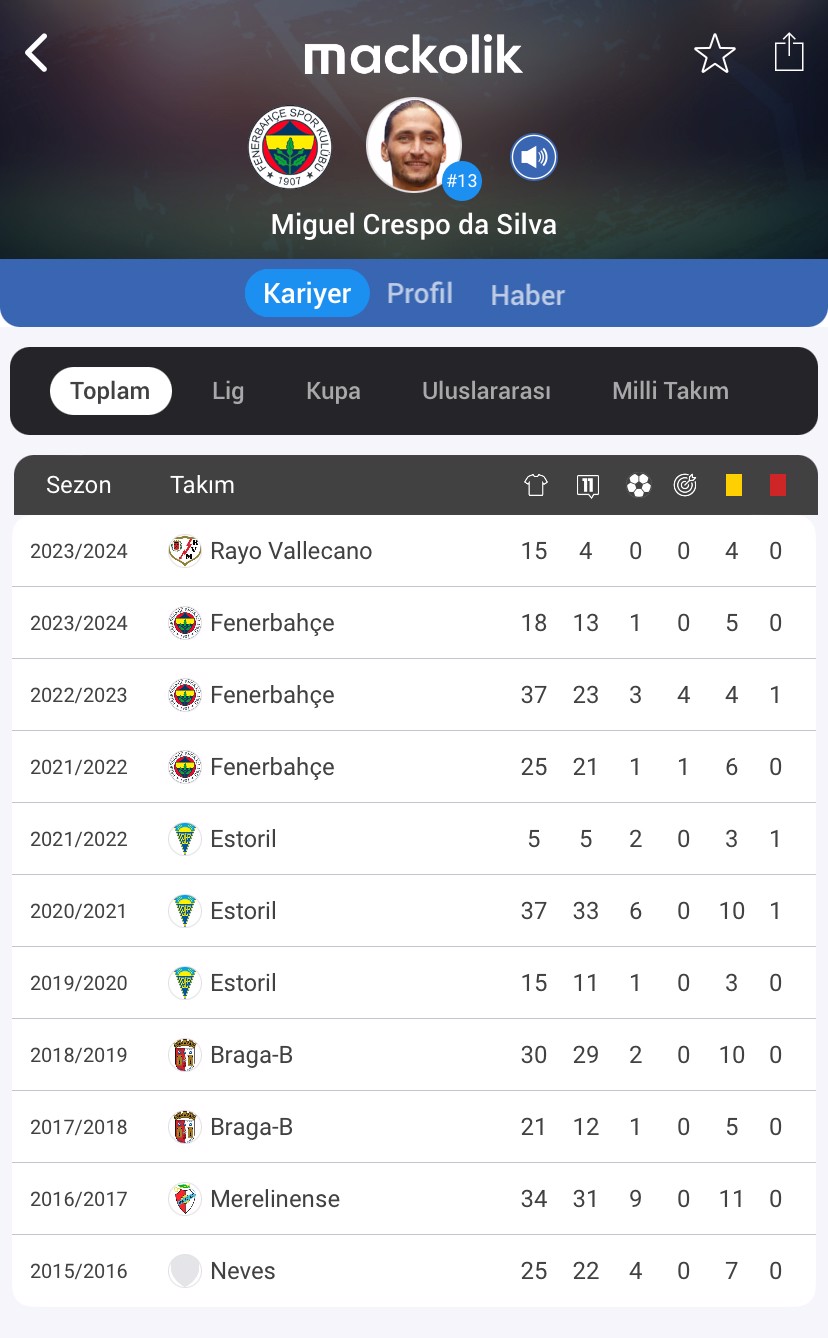 Miguel Crespo, sarı-lacivertli formayla toplam 80 maçta görev aldı ve 5 gol 7 asist kaydetti.