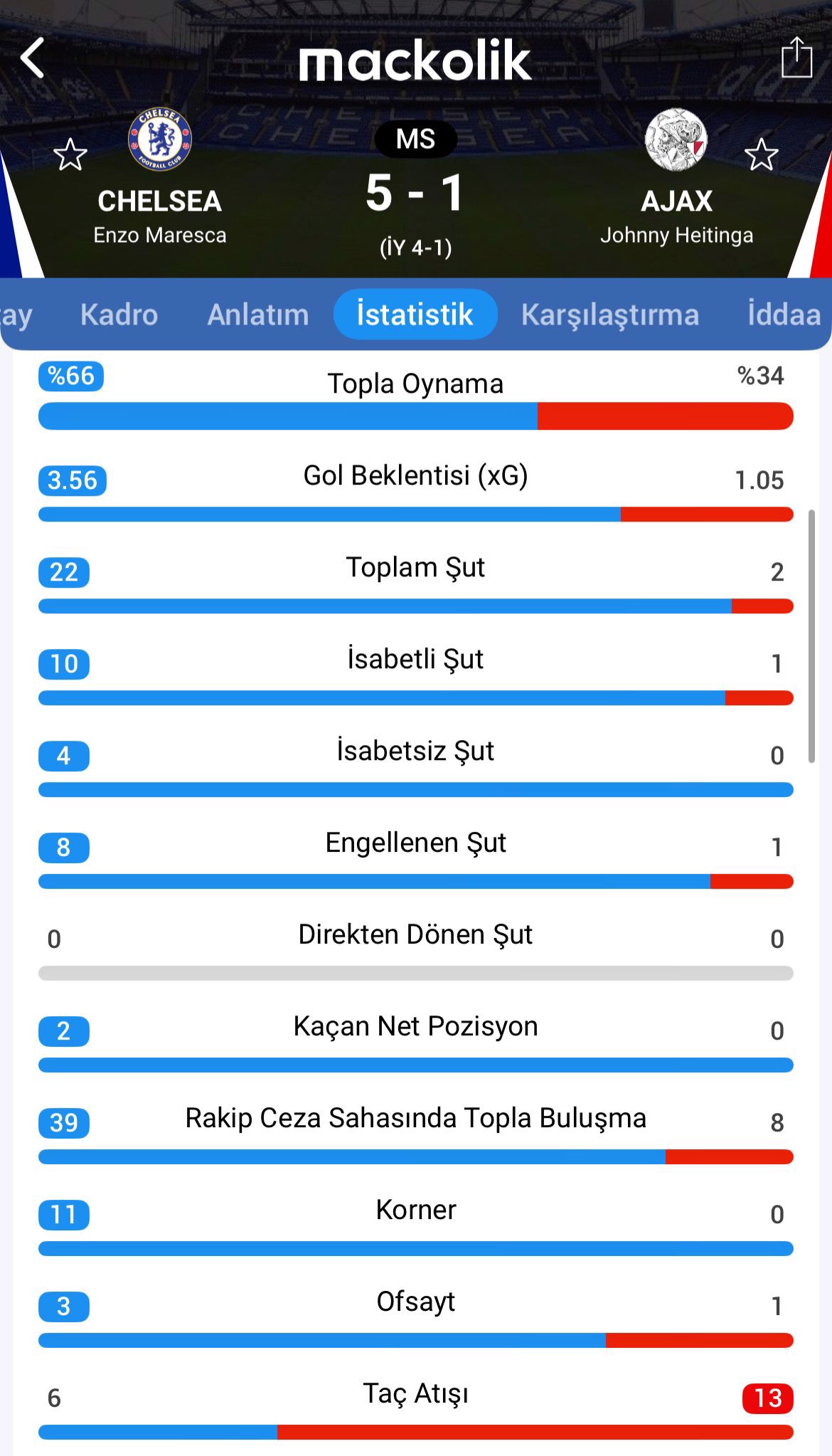 Kalan dakikalarda başka gol olmayınca Chelsea, Ajax'ı 5-1 mağlup etti.