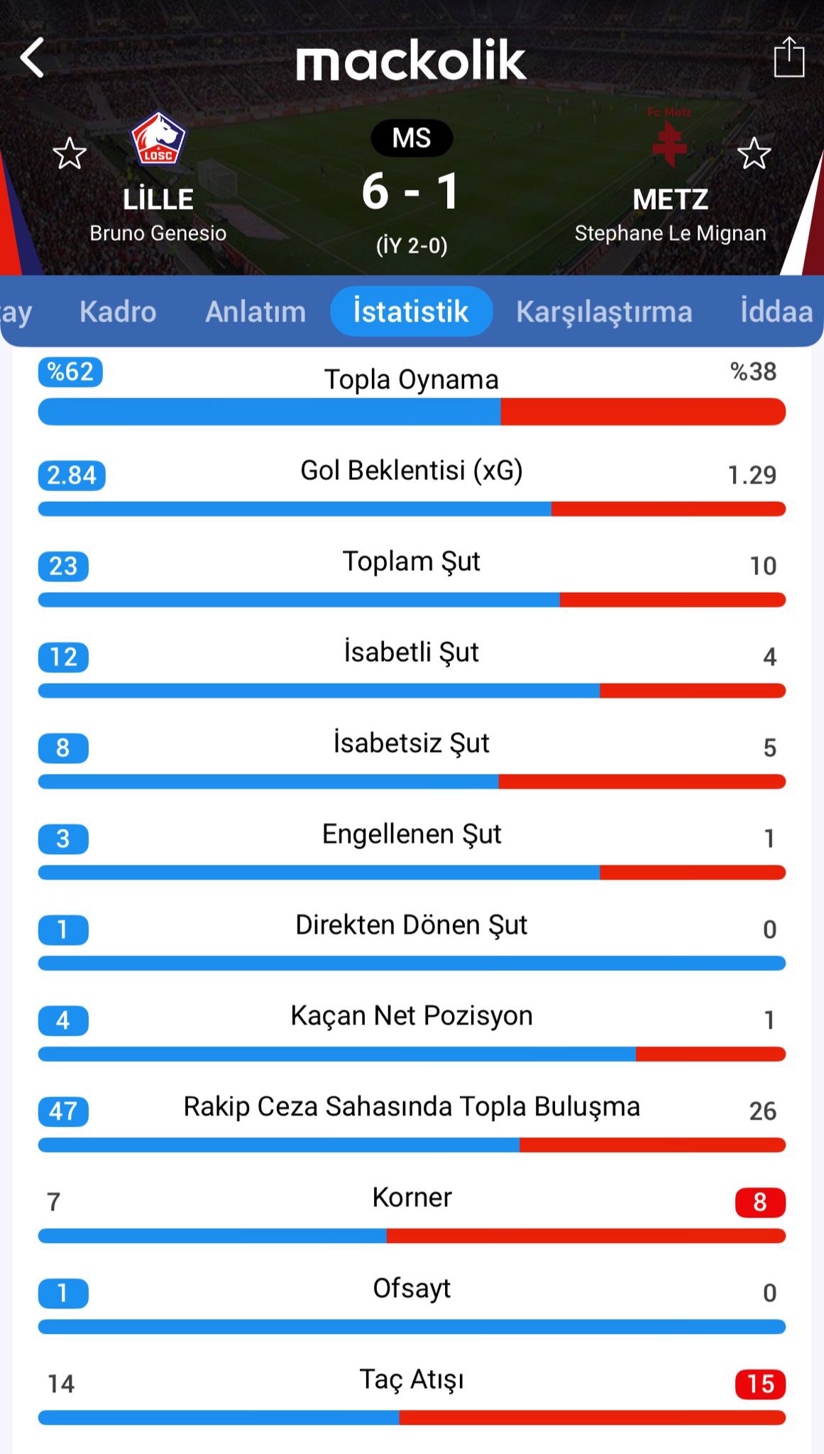 90+3. dakikada Hakon Haraldsson farkı 6'ya çıkartırken bu golden 2 dakika sonra Metz, Ibou Sane'nin golüyle skoru 6-1' getirdi ve maç bu skorla sona erdi.