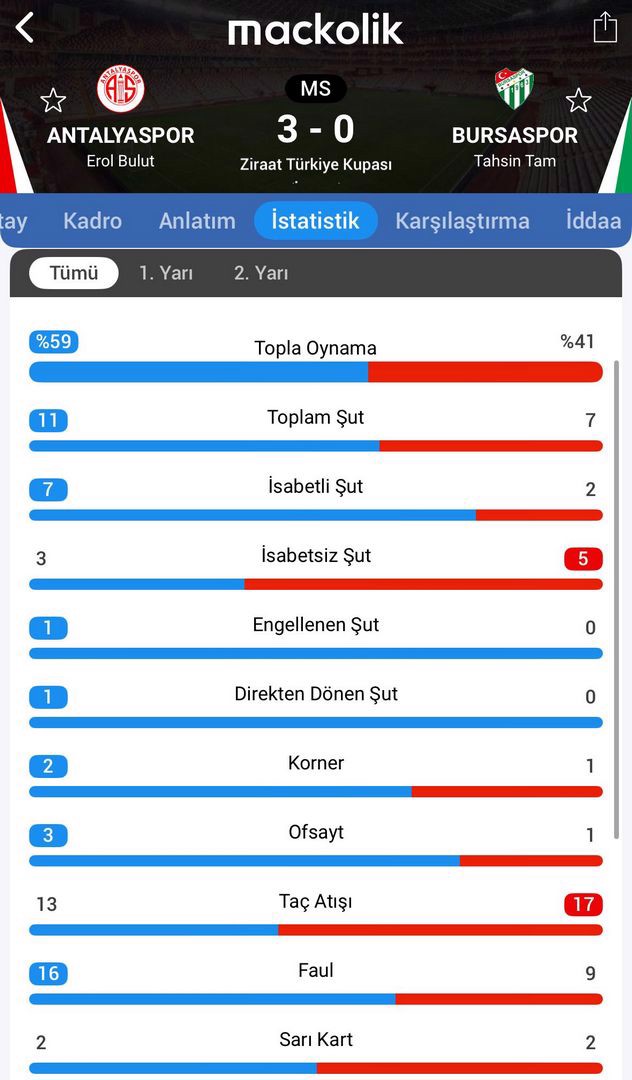 Ziraat Türkiye Kupası 3. turunda Süper Lig ekiplerinden Antalyaspor, 2. Lig ekibi Bursaspor'u ağırladı.