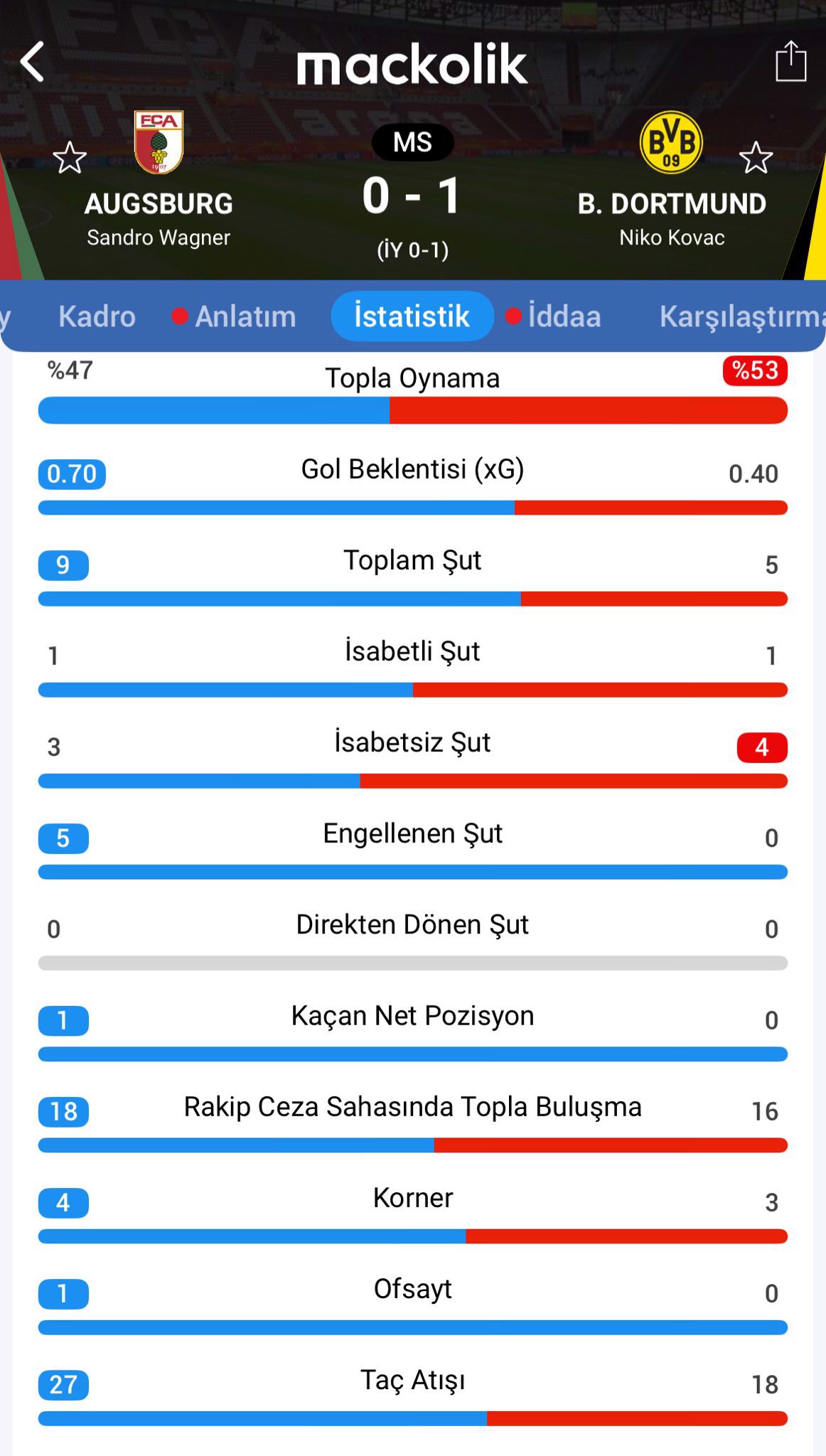 Maçın ikinci yarısında iki takımın da atakları golle sonuçlanmayınca Borussia Dortmund, Augsburg'u 1-0 yendi.