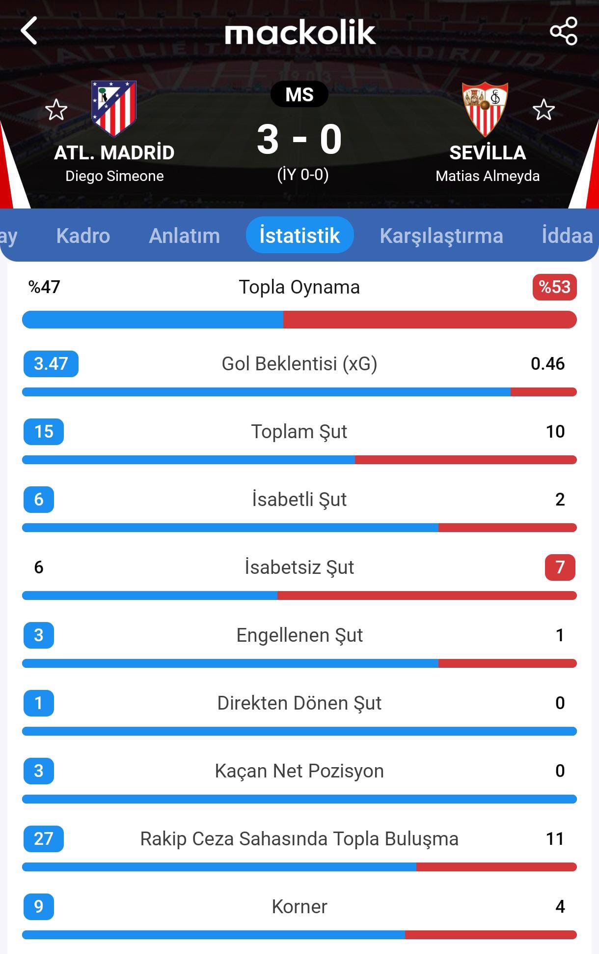 Bu sonuçla Atletico Madrid ligde üst üste üçüncü galibiyetini alarak maç fazlasıyla 4. sırada yer aldı. Sevilla ise üst üste üçüncü mağlubiyetini yaşadı.