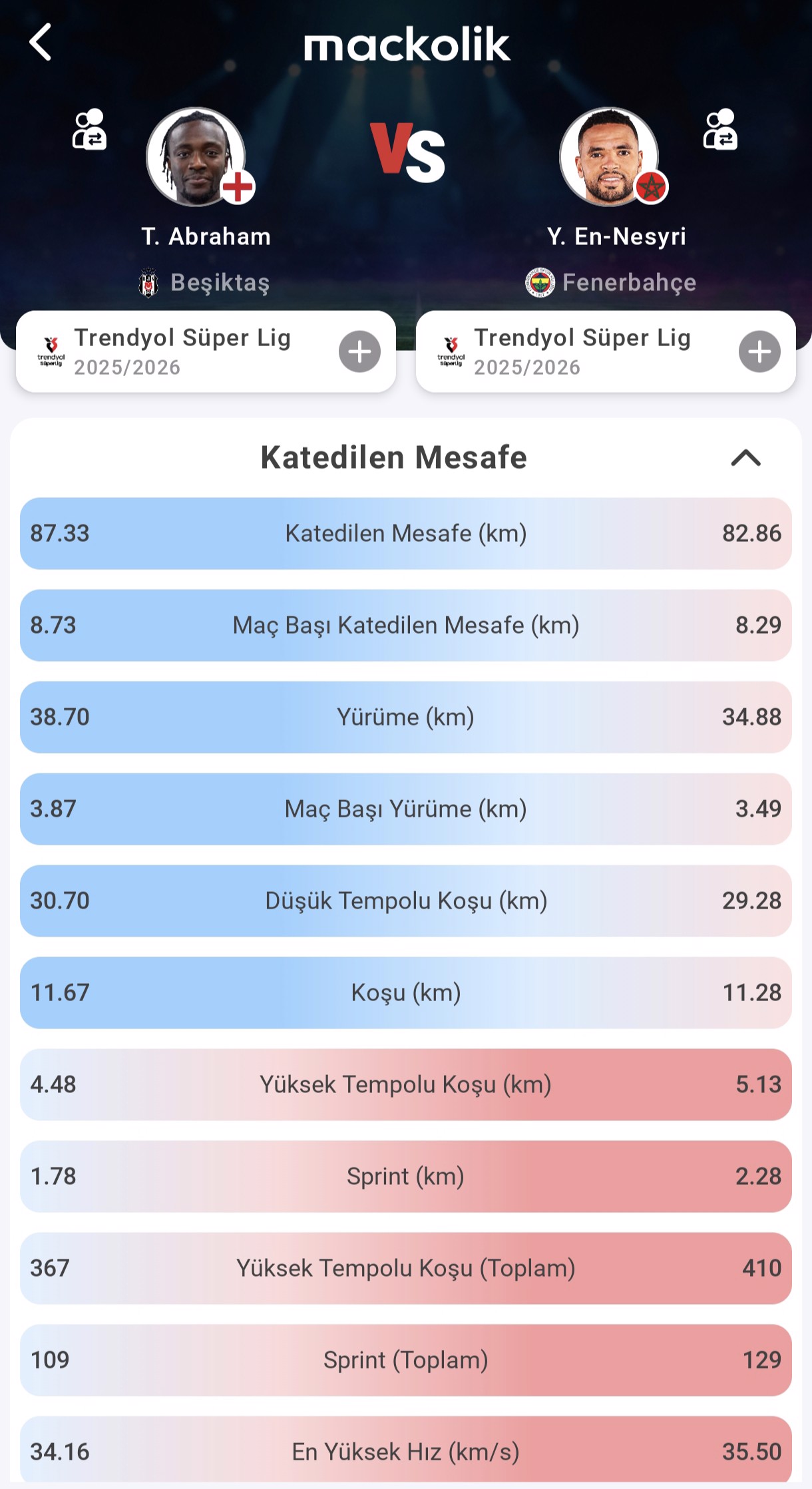 Youssef En-Nesyri ise benzer bir fiziksel dayanıklılıkla oynuyor. Faslı forvet 82.86 kilometre toplam mesafe kat etti ve maç başına 8.29 km koştu. Ancak fark, hız ve patlayıcılıkta ortaya çıkıyor: En-Nesyri'nin en yüksek hızı 35.50 km/s, yani Abraham'dan daha yüksek. Ayrıca 5.13 km yüksek tempolu koşu ve 2.28 km sprint değerleriyle daha patlayıcı bir profil çiziyor. 410 yüksek tempolu koşu ve 129 sprint verisi, onun ceza sahasına dikine koşularla girmeyi tercih eden bir santrfor olduğunu doğruluyor.