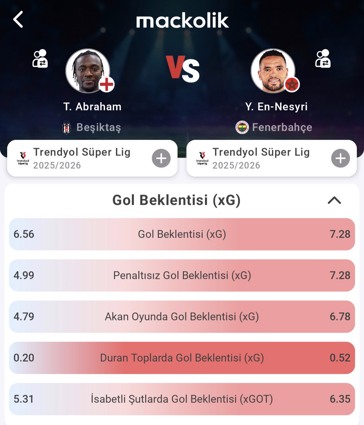 Youssef En-Nesyri ise bu alanda biraz daha yüksek bir üretim grafiğine sahip. Faslı forvetin toplam gol beklentisi 7.28, üstelik tamamı penaltısız pozisyonlardan geldi. 6.78'lik akan oyun xG'si, onun ceza sahası içinde sürekli doğru pozisyon aldığını gösteriyor. 0.52 duran top xG'si ise hava toplarındaki üstünlüğünün bir yansıması. Ayrıca 6.35 xGOT değeriyle, kaleyi bulduğu şutların gol olma olasılığı lig ortalamasının oldukça üzerinde.