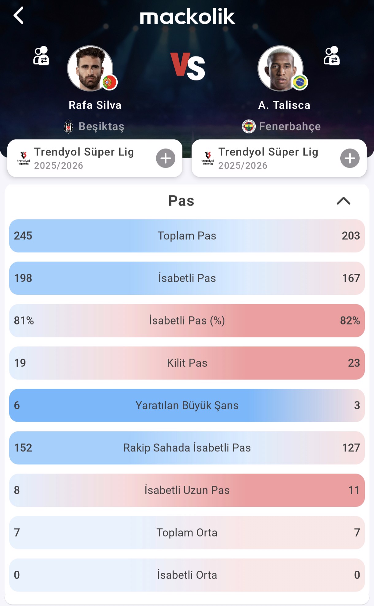 Anderson Talisca ise pas kalitesinde benzer bir başarı oranına sahip olmasına rağmen ( %82 isabet oranı ), pasların yönü ve niteliği açısından farklı bir profil çiziyor. 203 pas denemesi, 23 kilit pas ve 3 büyük şans yaratma verileriyle Fenerbahçe'nin hücum hattına doğrudan katkı sağlıyor. Ayrıca 11 isabetli uzun pasla oyunun yönünü sık sık değiştiren Talisca, geriden aldığı topları riskli ama etkili biçimde üçüncü bölgeye aktarıyor.