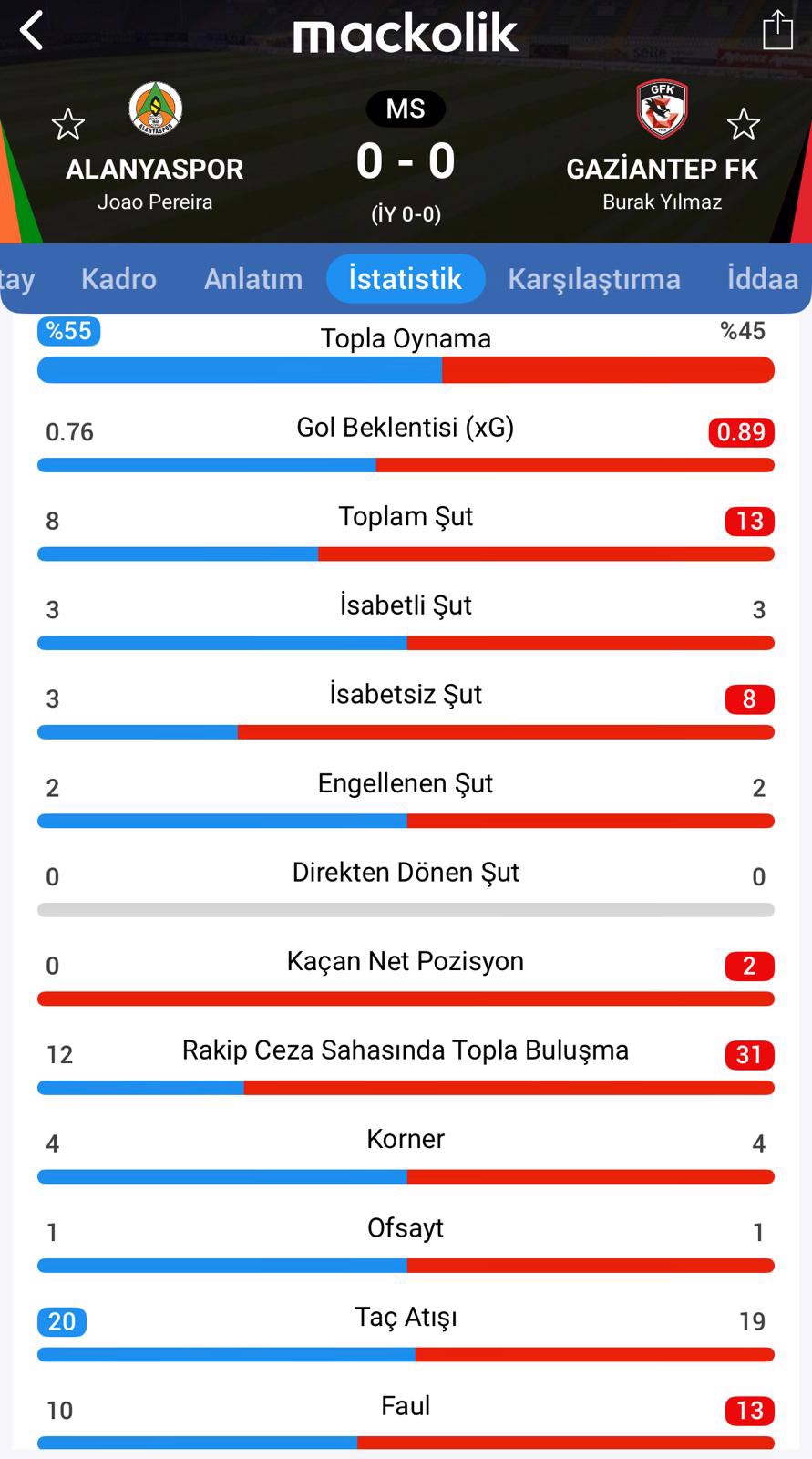Öte yandan Gaziantep FK teknik direktörü Burak Yılmaz, 55. dakikada hakeme itirazlarından dolayı sarı kart gördü.