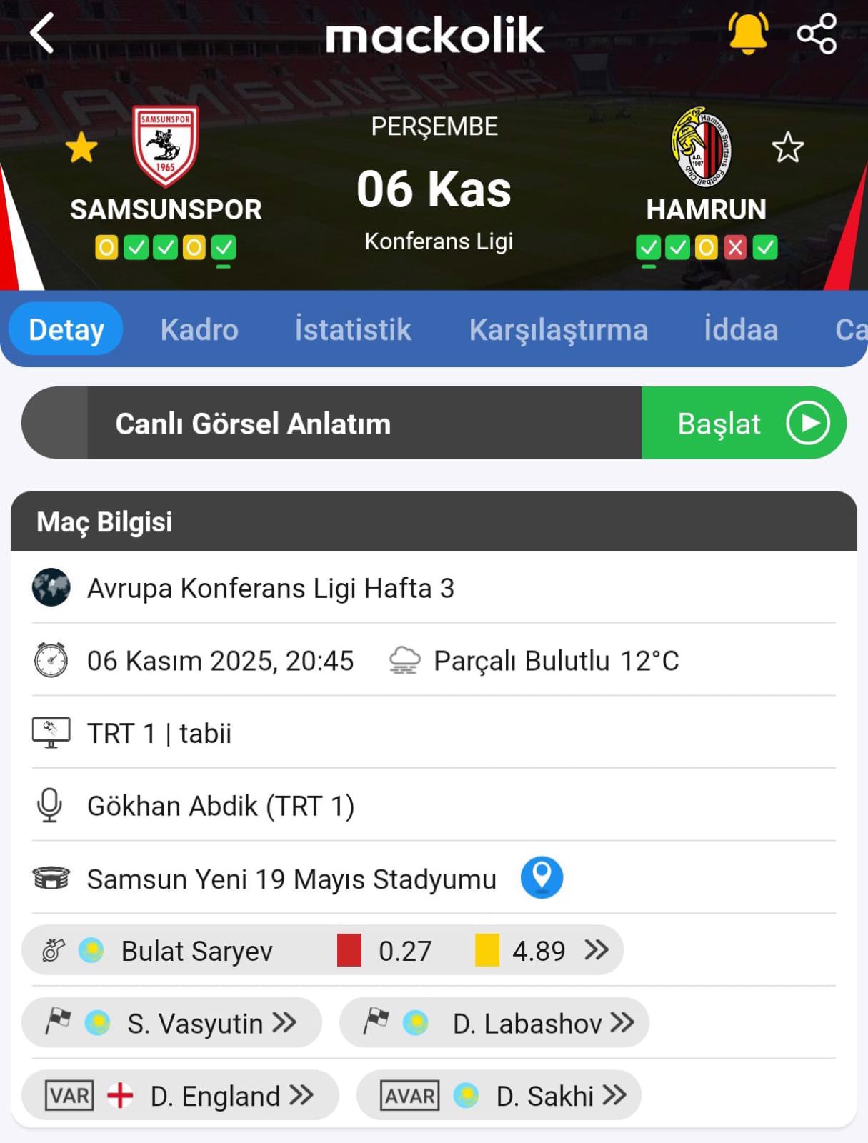 Karşılaşmanın 4. hakemi ise Arman Ismuratov olacak.