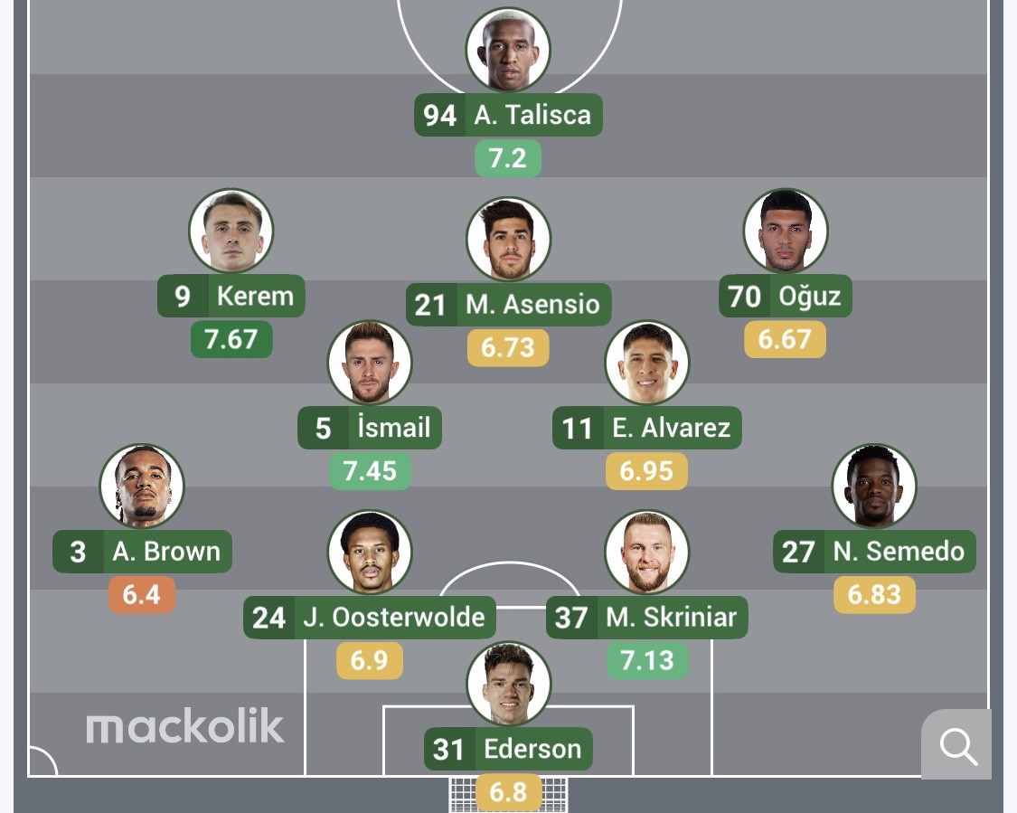 Fenerbahçe: Ederson, Semedo, Skriniar, Oosterwolde, Brown, Alvarez, İsmail Yüksek, Oğuz Aydın, Asensio, Kerem Aktürkoğlu, Talisca