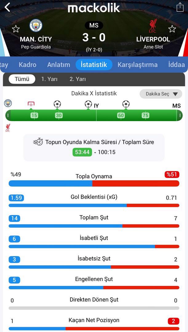 45+3'te sahneye Nico Gonzalez çıktı ve farkı ikiye çıkardı. City soyunma odasına 2-0 önde girdi.