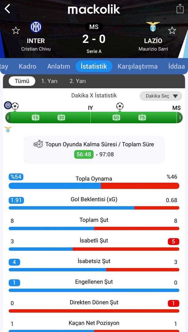Mücadelenin kalan bölümünde skor değişmedi ve Inter sahadan 2-0 galip ayrıldı.
