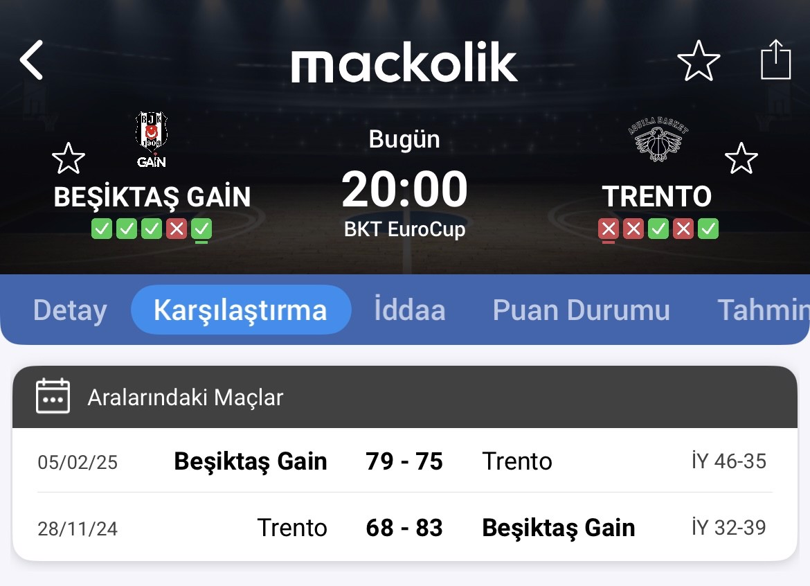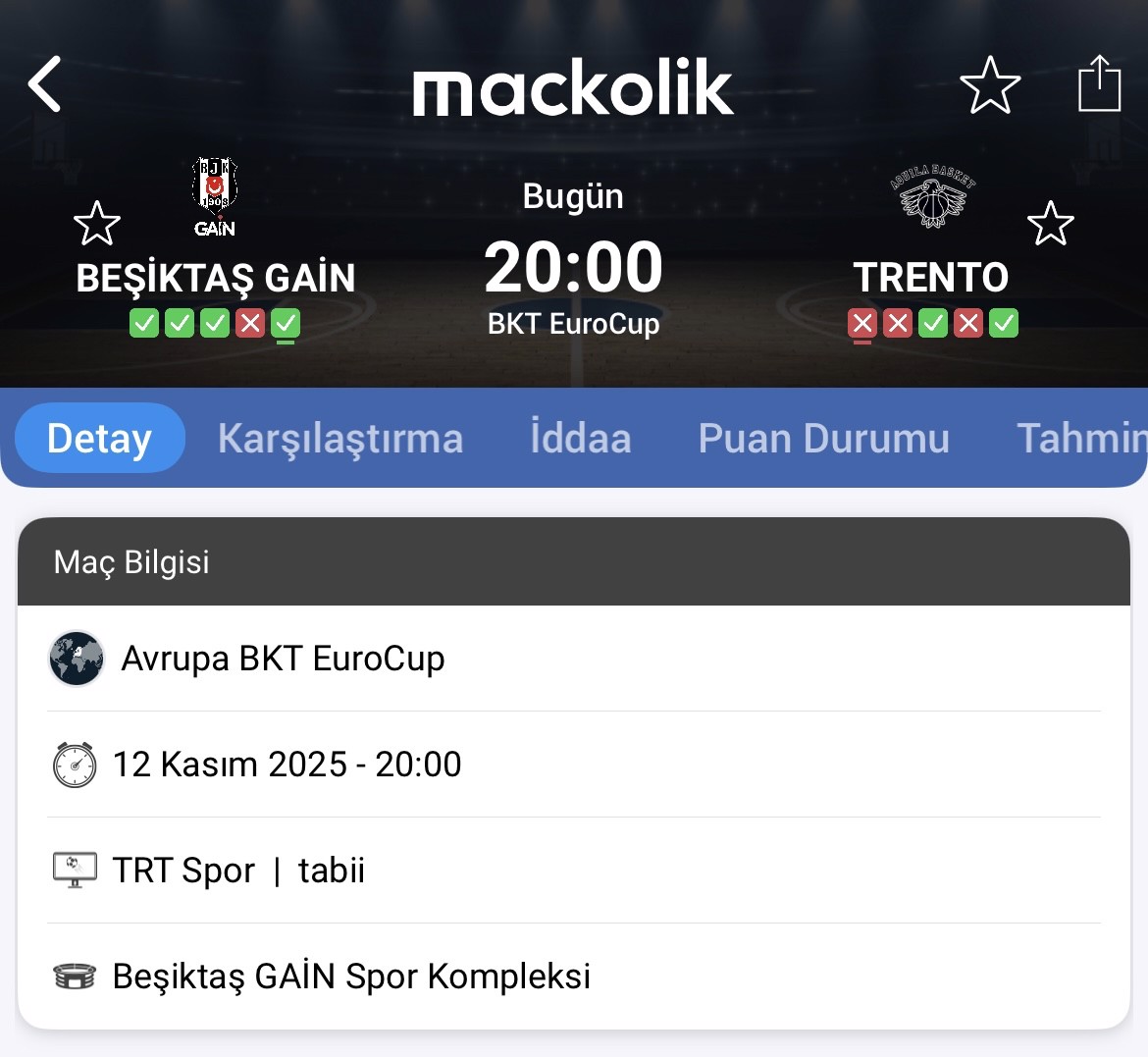 Beşiktaş GAİN Erkek Basketbol Takımı, EuroCup B Grubu 7. hafta maçında İtalyan temsilcisi Trento'yu konuk edecek.
