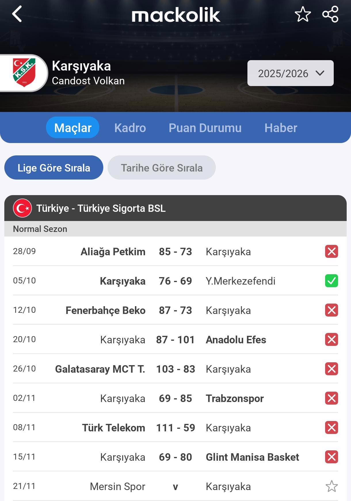 Beşinci haftada Galatasaray MCT Technic'e 103-83 yenilen Karşıyaka, altıncı haftada da Trabzonspor karşısında 85-69'luk skorla sahadan mağlup ayrıldı.
