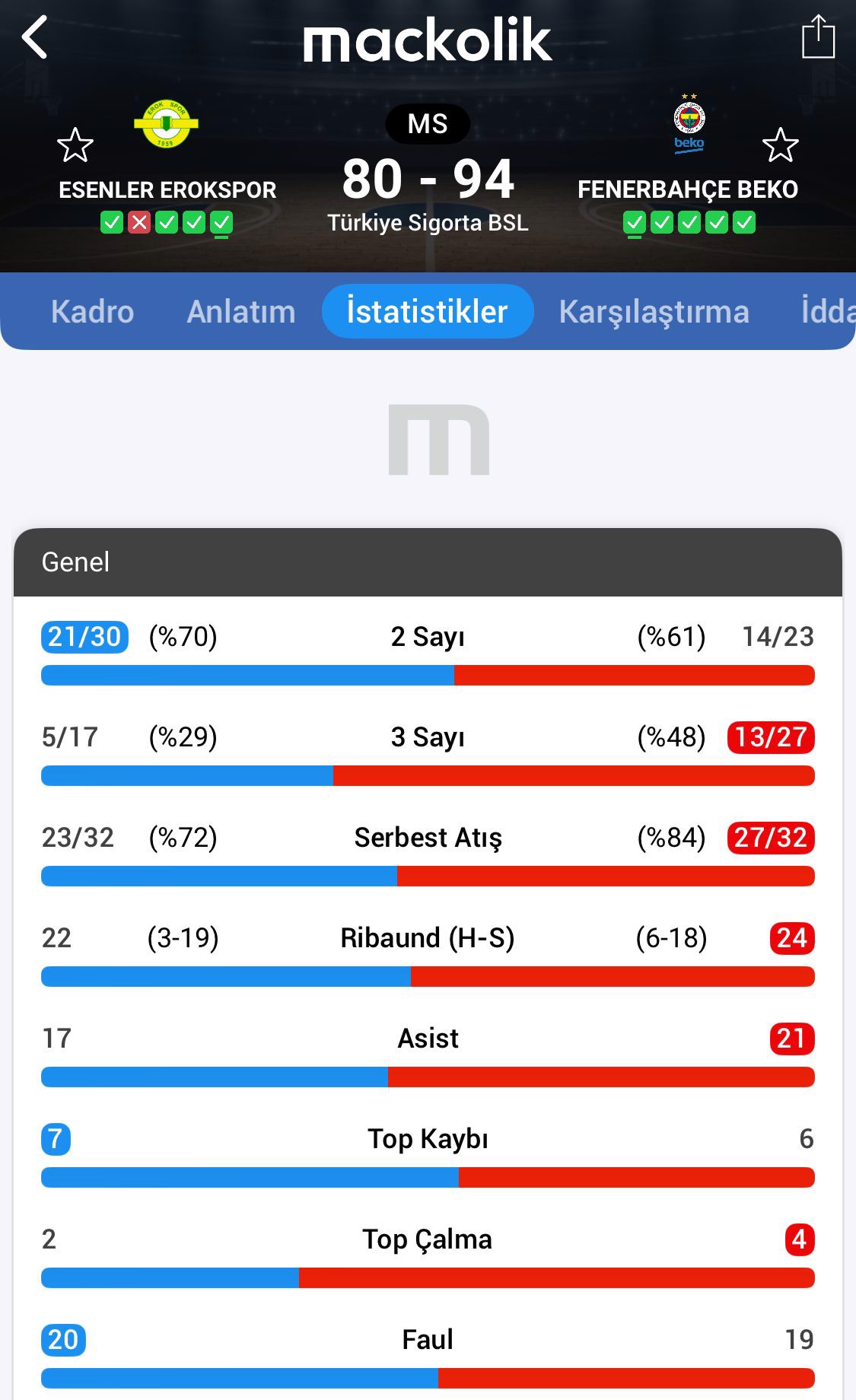 Basketbol Süper Ligi'nde 8. haftanın kapanış maçında Esenler Erokspor ve Fenerbahçe Beko karşılaştı.