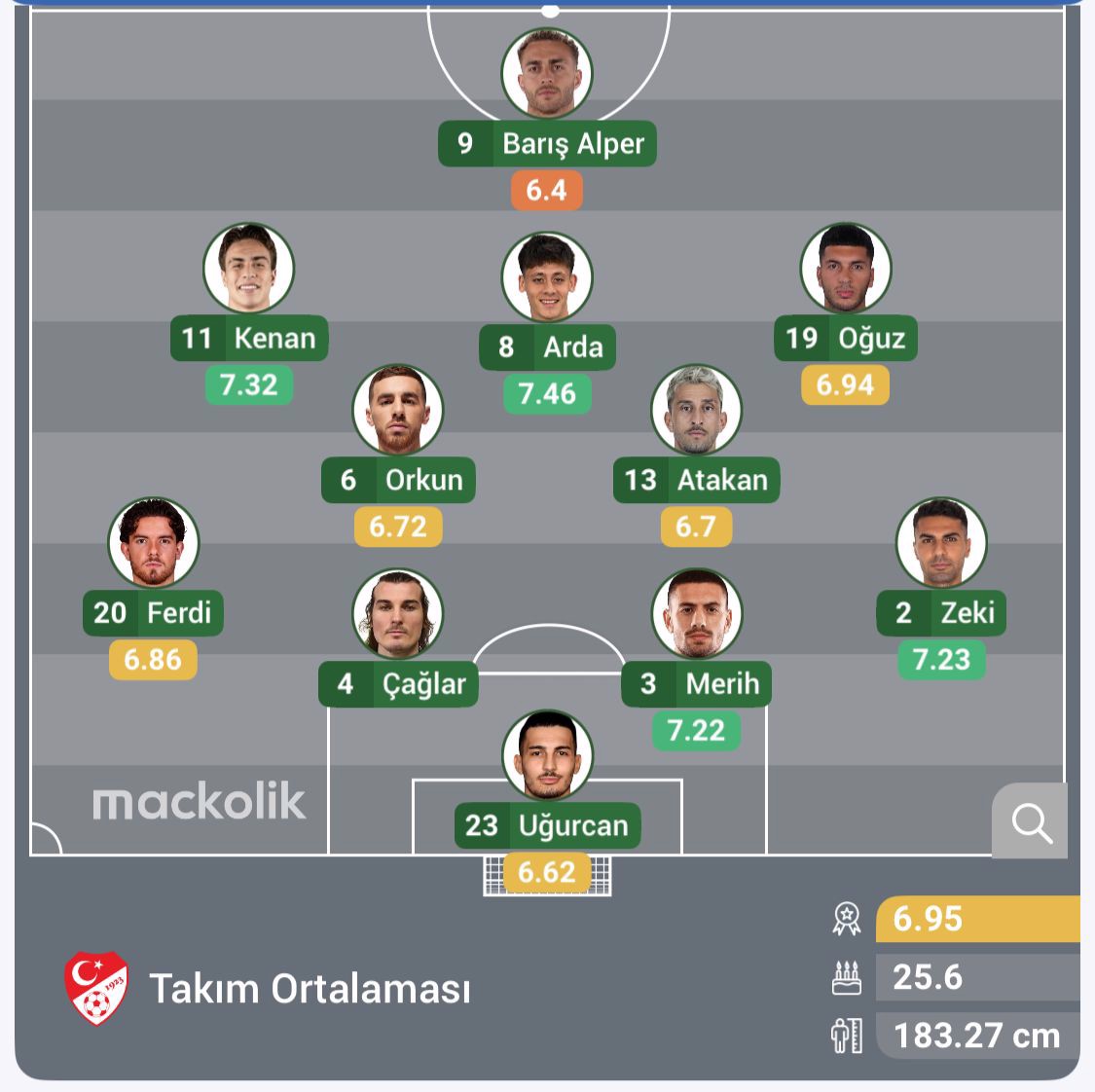 Türkiye: Uğurcan, Zeki, Merih, Çağlar, Ferdi, Atakan, Orkun, Oğuz, Arda, Kenan, Barış Alper