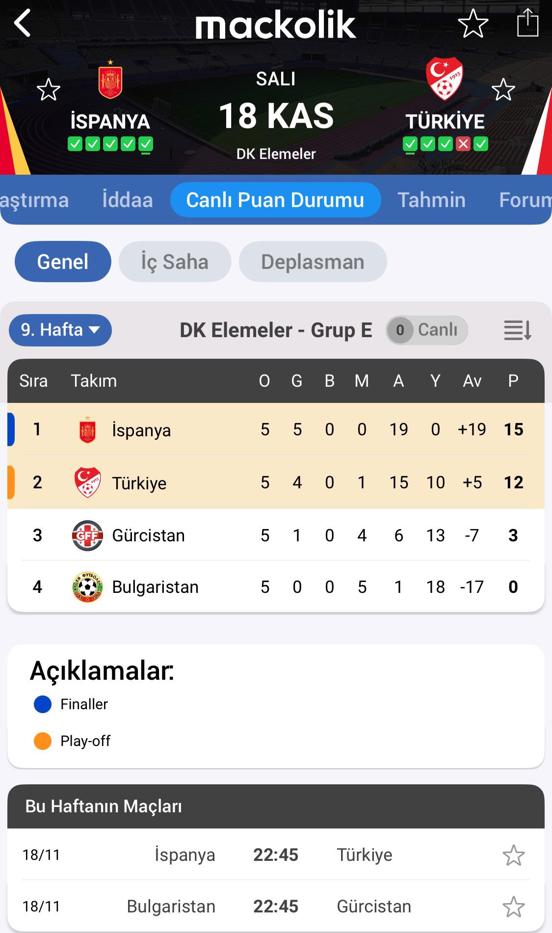 E Grubu'nda son maçlar öncesinde İspanya ve Türkiye, grubu ilk iki içinde bitirmeyi garantiledi. Ay-yıldızlı ekibimiz, 12 puanla ikinci, İspanya ise 15 puanla liderlik koltuğunda yer alıyor. Milli takımımızın kazanması durumunda genel averaja bakılacak. Son maç öncesinde İspanya'nın, Türkiye'ye 14 gol averaj üstünlüğü bulunuyor. Türkiye'nin liderlik ve Dünya Kupası'na doğrudan katılımı için matematiksel olarak tek şansı İspanya'yı 7 farklı mağlup etmesinden geçiyor.