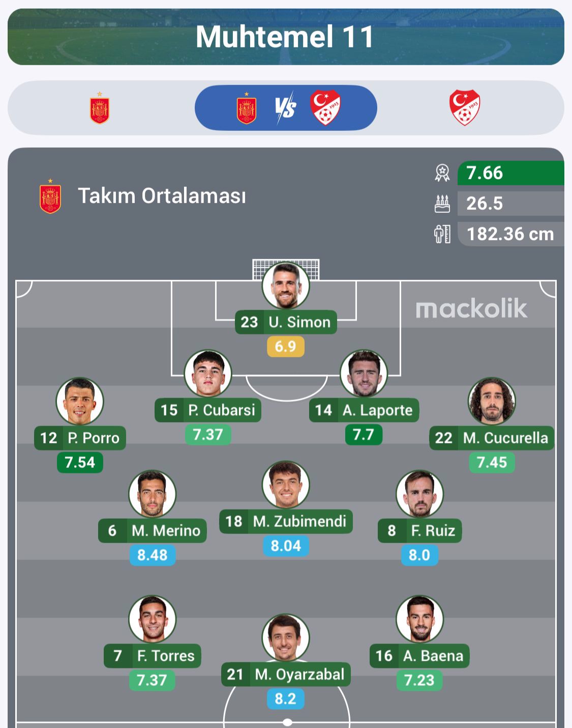 İspanya: Simon, Porro, Cubarsi, Laporte, Cucurella, Zubimendi, Merino, Ruiz, Torres, Baena, Oyarzabal