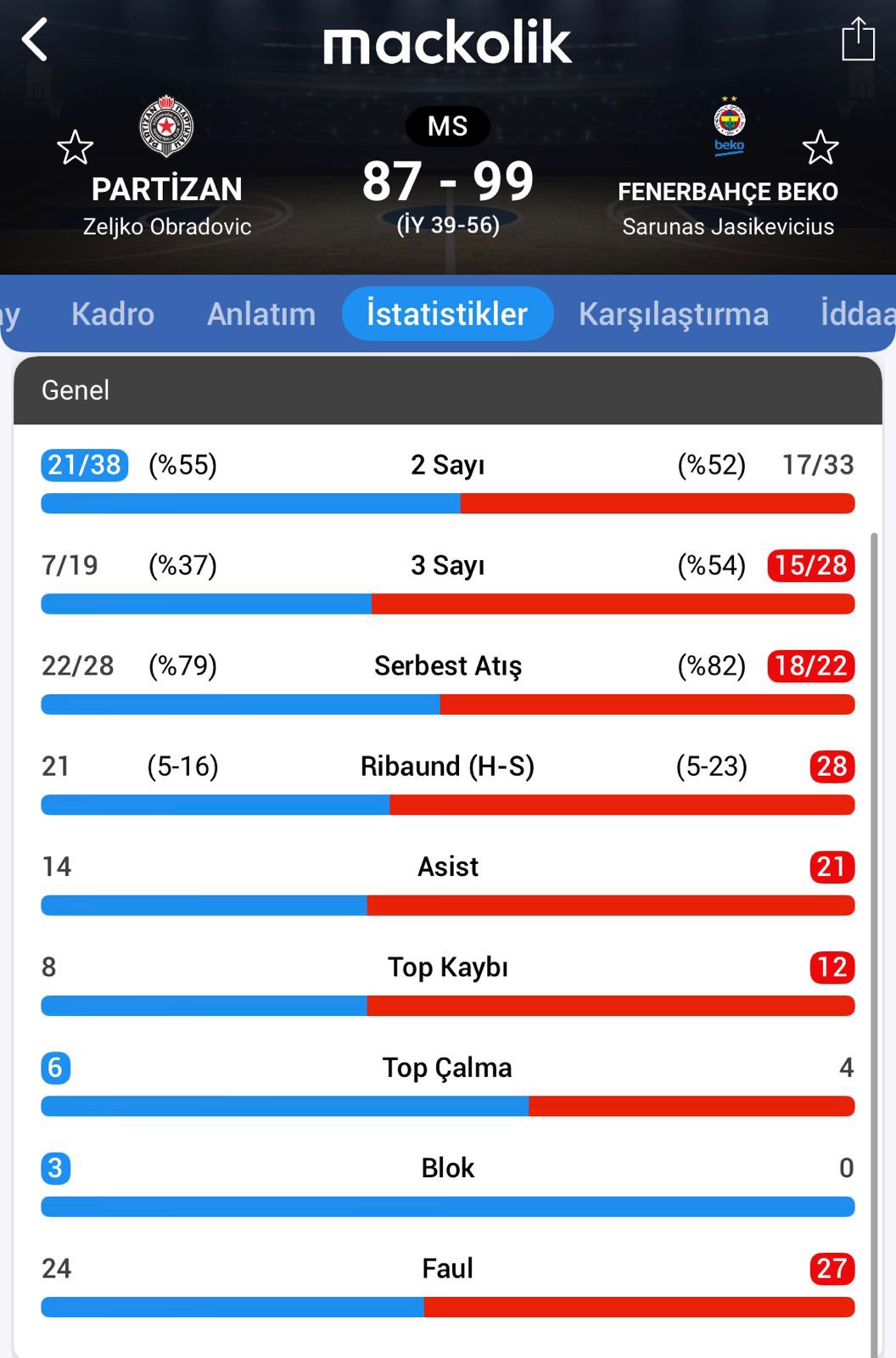 Maçın en skorer oyuncusu attığı 27 sayıyla Partizan'dan Sterling Brown olurken temsilcimizde Mikael Jantunen, 19 sayı atarak takımın en fazla sayı atan oyuncusu oldu. Jantunen'i Wade Baldwin 15, Tarık Biberoviç 14, Bonzie Colson 12 ve Nicolo Melli 11 sayıyla takip etti.