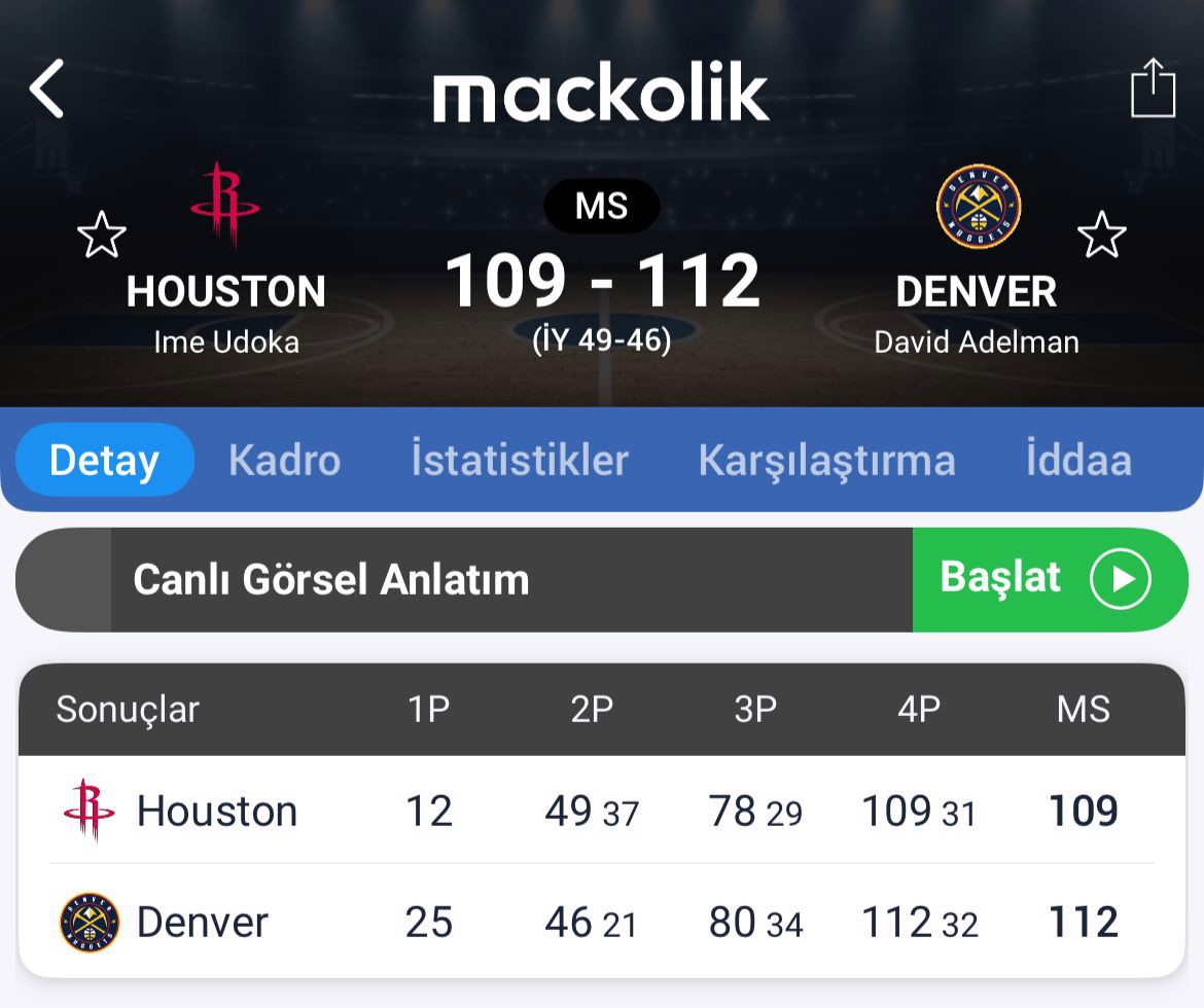 NBA Cup?ta Denver Nuggets, deplasmanda Houston Rockets?ı 112-109 mağlup etti. Alperen Şengün, karşılaşmayı 14 sayı, 5 ribaund ve 6 asistle tamamladı.