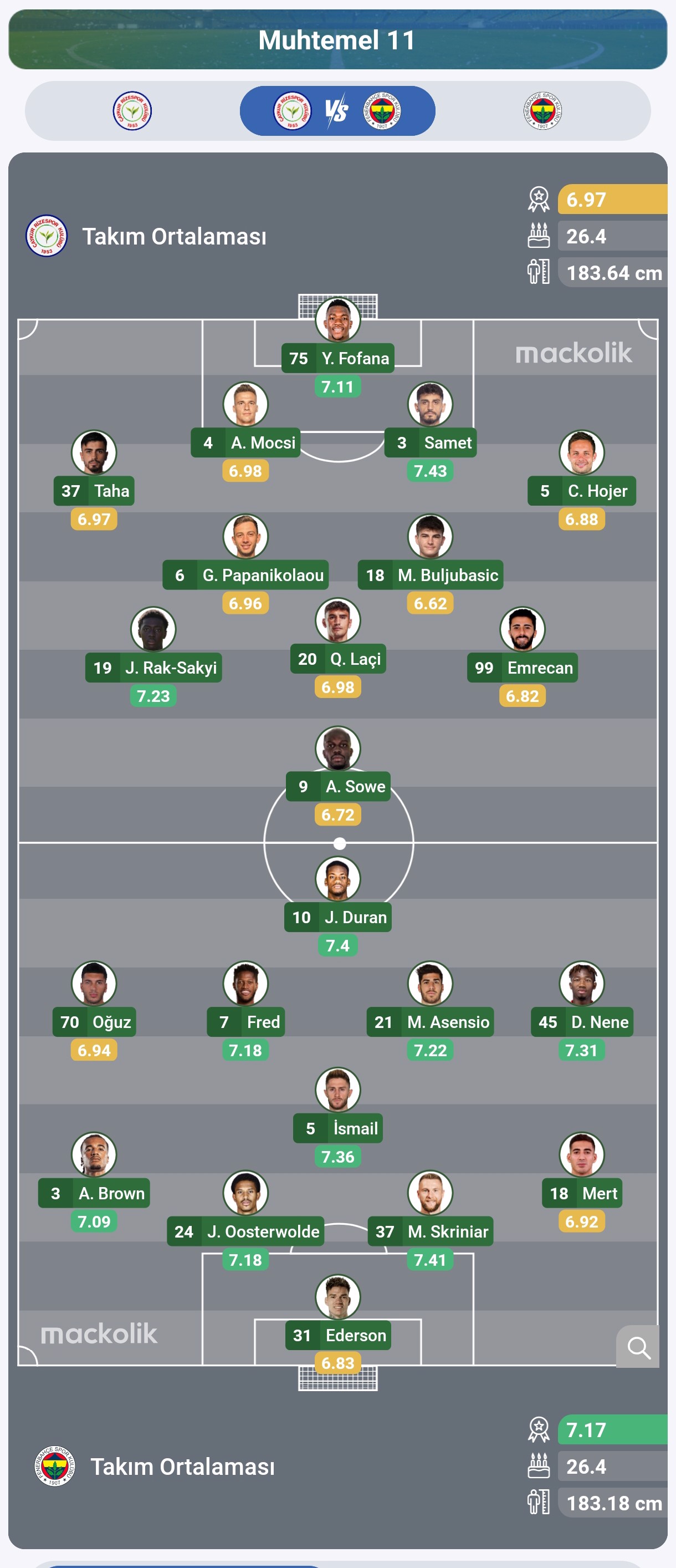 Fenerbahçe: Ederson, Mert Müldür, Skriniar, Oosterwolde, Brown, İsmail Yüksek, Nene, Asensio, Fred, Oğuz Aydın, Duran
