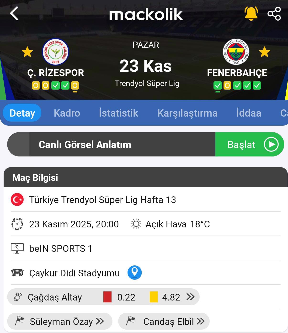 Çaykur Didi Stadı'nda saat 20.00'de başlayacak müsabakayı hakem Çağdaş Altay yönetecek.