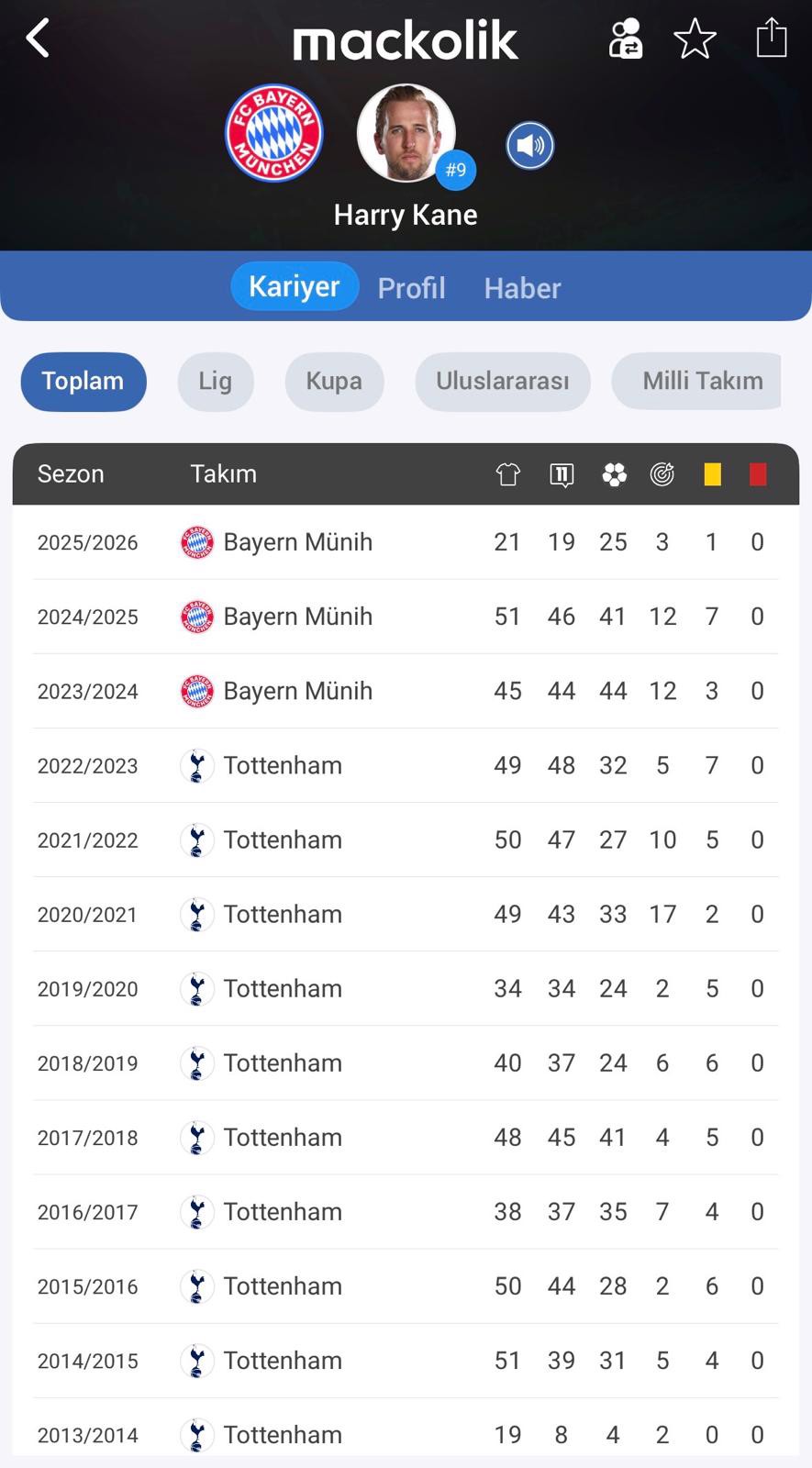 Bu sezon gösterdiği performansla büyük kulüplerin radarında olan Harry Kane, Bayern Münih formasıyla bu sezon 21 maçta 25 gol ve 3 asistlik performansıyla göz doldurdu.