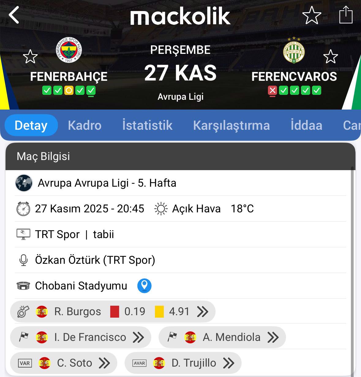 Chobani Stadı'nda saat 20.45'te başlayacak müsabakayı İspanyol hakem Ricardo de Burgos yönetecek.