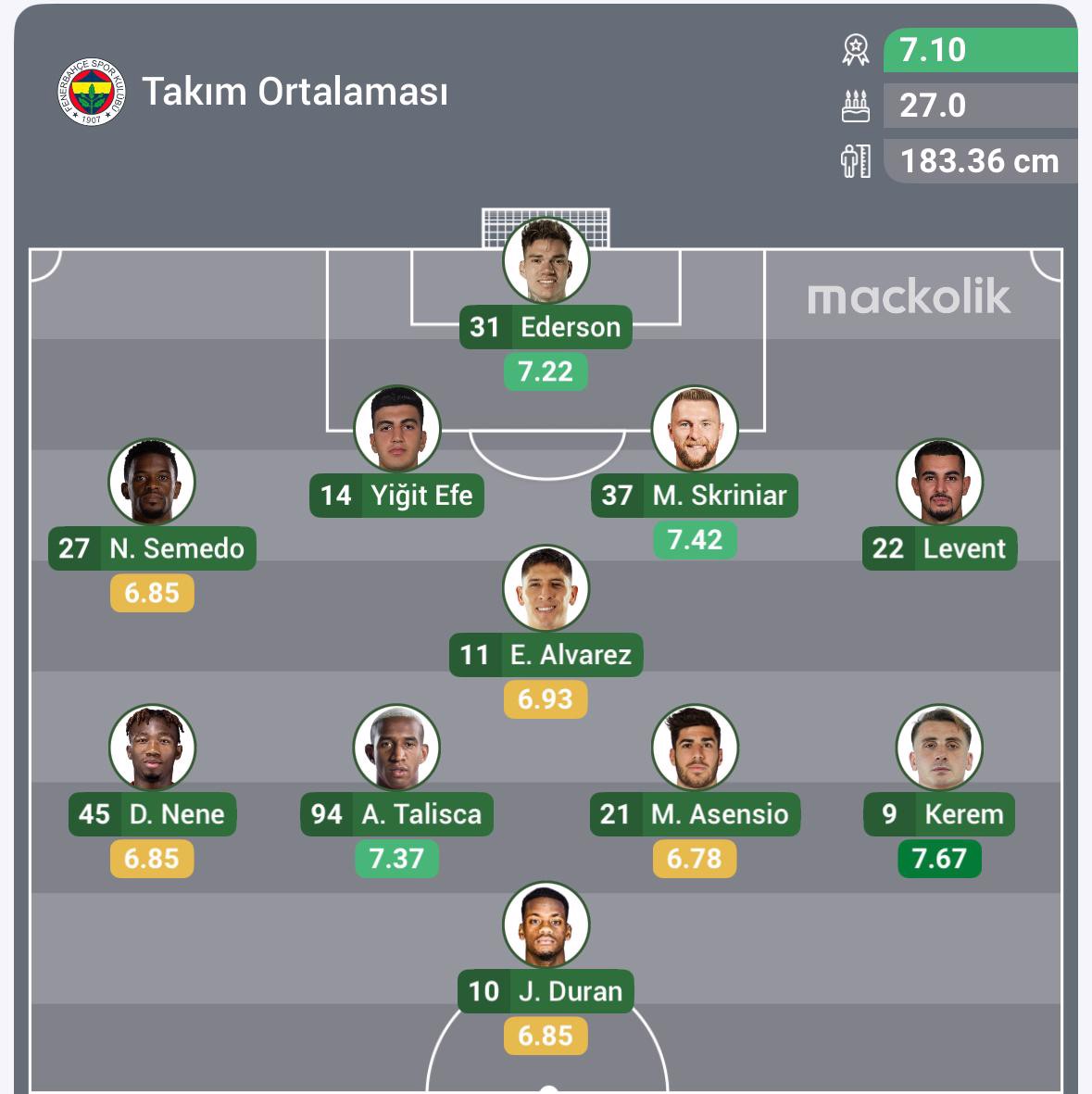 Fenerbahçe: Ederson, Semedo, Yiğit Efe Demir, Skriniar, Levent Mercan, Alvarez, Nene, Talisca, Asensio, Kerem Aktürkoğlu, Duran