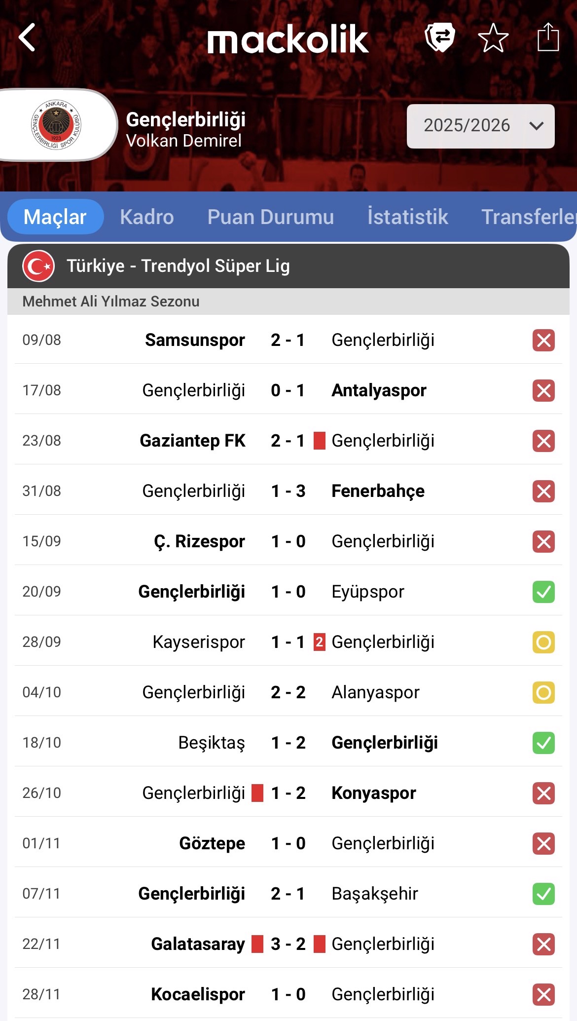 Kırmızı-siyahlılar, teknik direktör Volkan Demirel yönetiminde çıktığı 4 karşılaşmada ise 3 mağlubiyet yaşadı. Bu yenilgilerin tamamını deplasmanda alan başkent ekibi, ligin 12. haftasında Başakşehir'i sahasında 2-1 yenmişti.