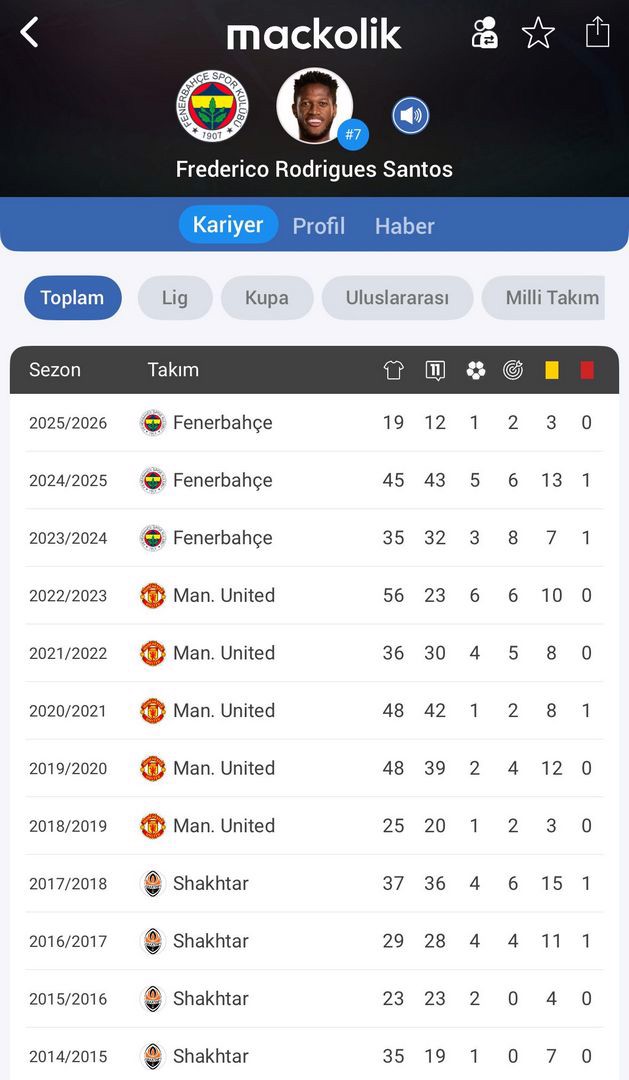 Geçen sezon ligde 31, UEFA Şampiyonlar Ligi Elemeleri'nde 2, Avrupa Ligi'nde 10, Ziraat Türkiye Kupası'nda da 2 maçta oynayan Fred, toplamda 45 müsabakada sahaya çıktı.
