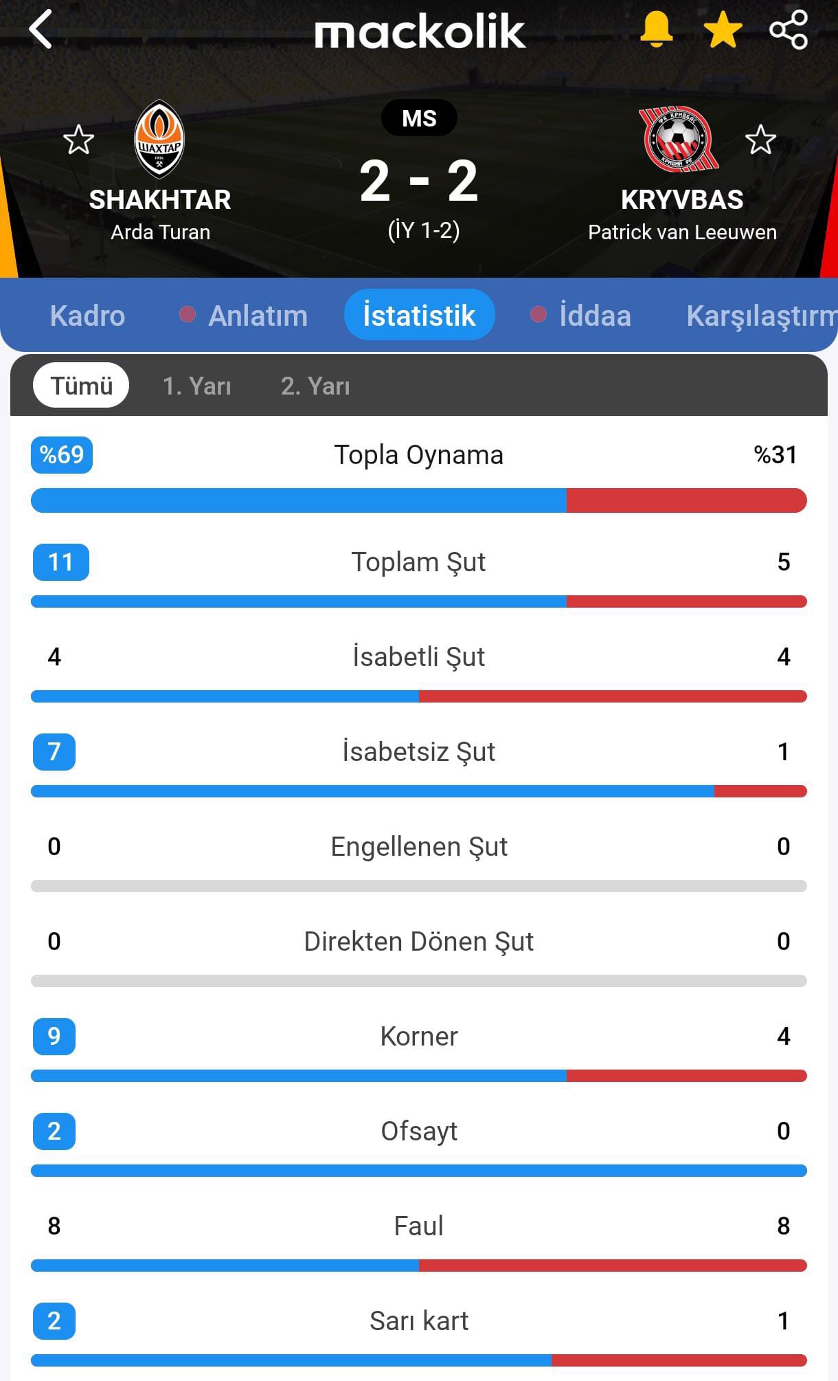 İlk yarı 2-1 Kryvbas üstünlüğüyle sonuçlandı.
