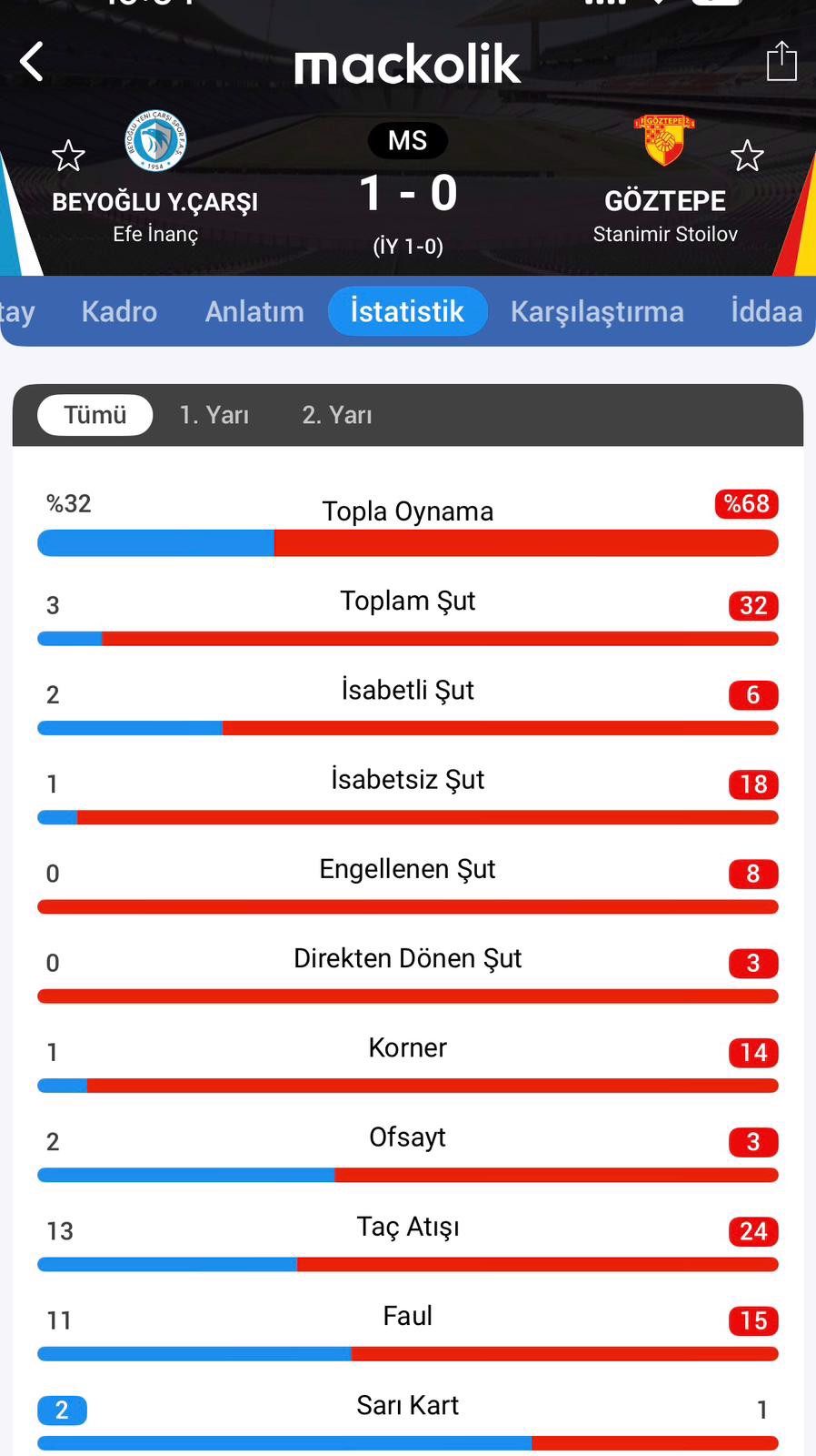 6. dakikada aut atışını paslaşarak kullanan Beyoğlu Yeni Çarşı'da uzun oynamak isteyen kaleci Fatih Yeniay'ın vuruşunda, top baskı yapan Janderson'a çarparak direğin yanından dışarı gitti.
