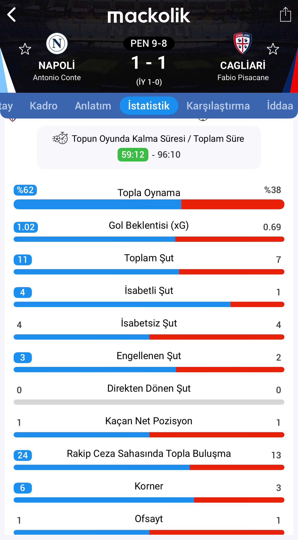 Cagliari'de 7. penaltıyı Felici kaçırdı ve Napoli avantajlı duruma geçti.