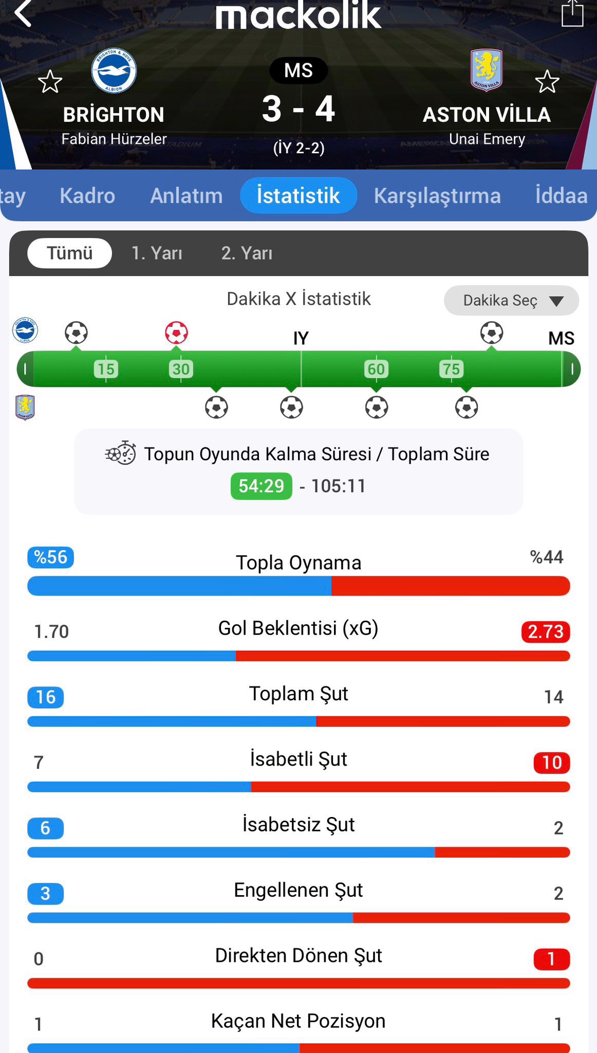 Ligde 8. galibiyetini alan Aston Villa puanını 27'ye yükselterek ilk 5 içerisinde yer aldı. Brighton ise 4. mağlubiyetini alarak 22 puanda kaldı.
