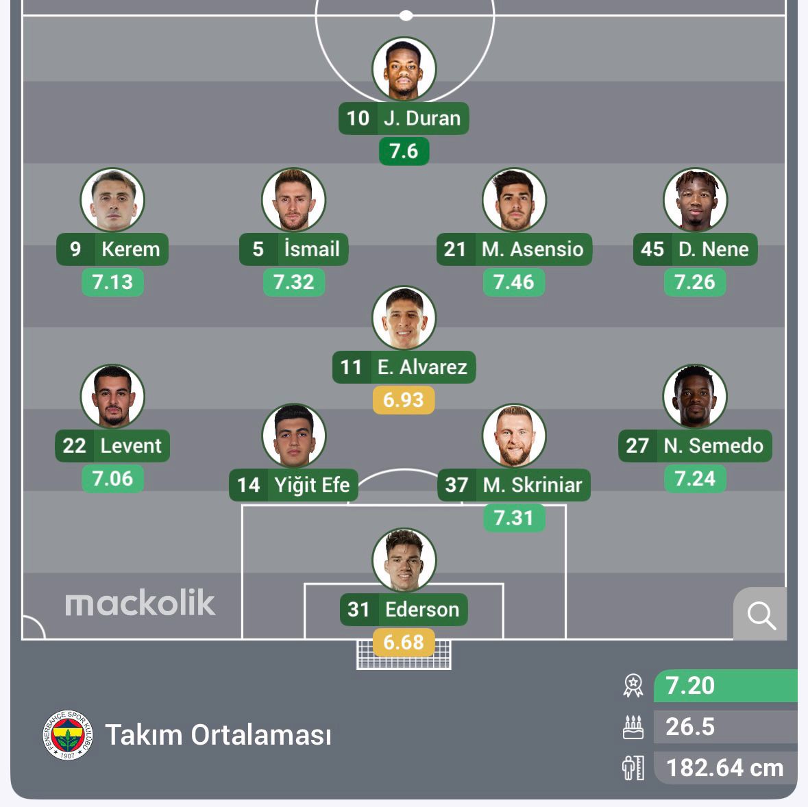 Fenerbahçe: Ederson, Semedo, Skriniar, Yiğit Efe Demir, Levent Mercan, Nene, Asensio, Alvarez, İsmail Yüksek, Kerem Aktürkoğlu, Jhon Duran