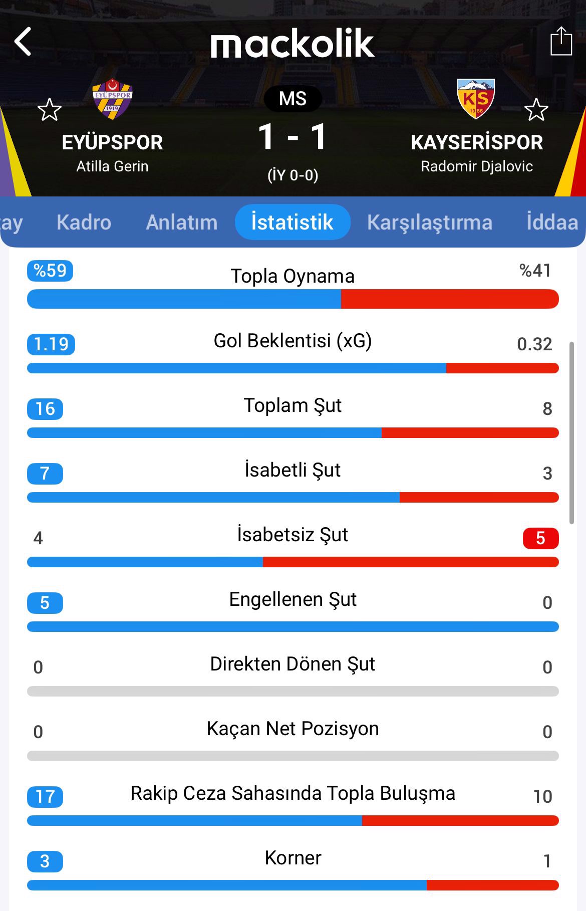 Kalan dakikalarda başka gol olmayınca Eyüpspor ile Kayserispor, 1-1 berabere kaldı.