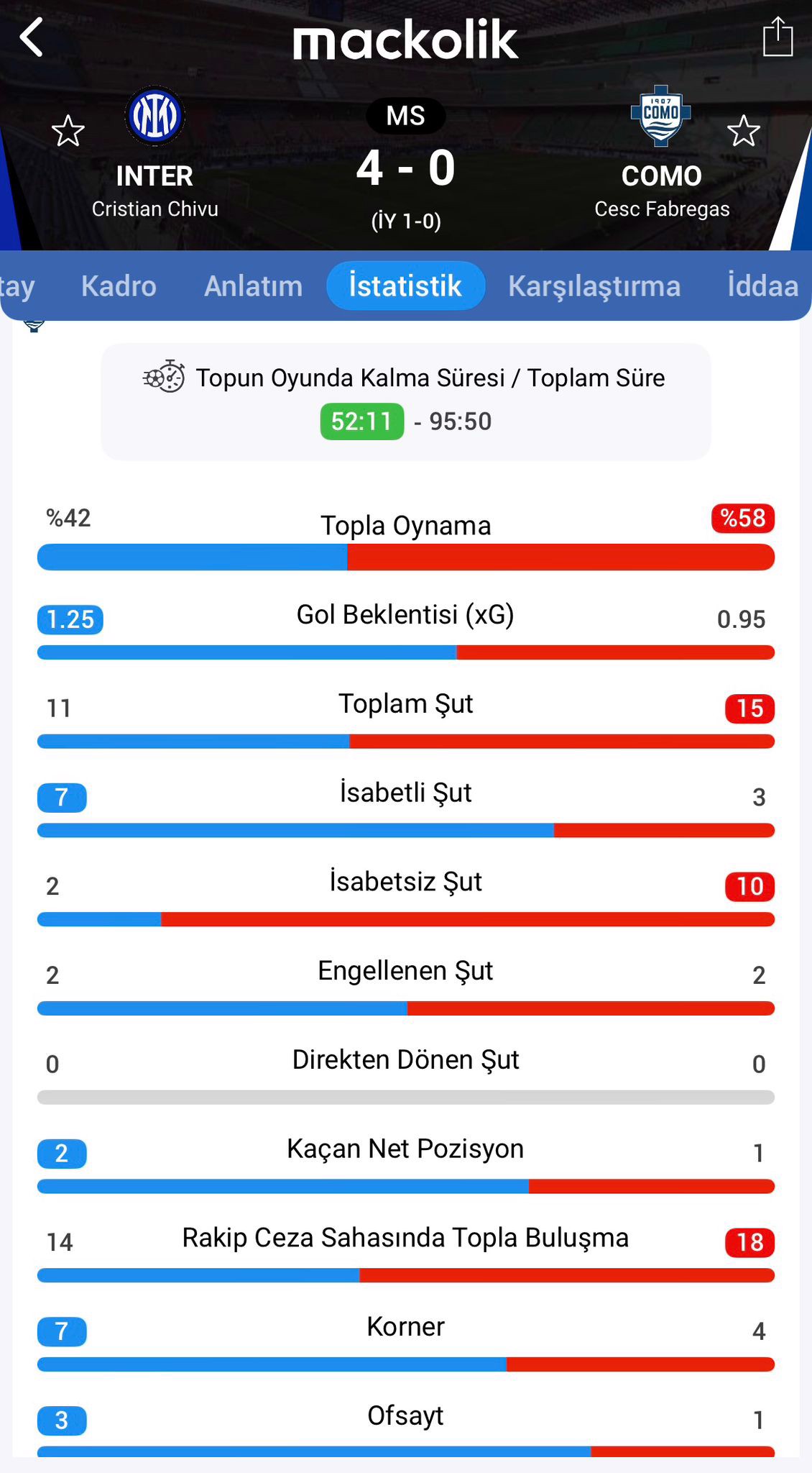Serie A'da 10. galibiyetini alan Inter, maç fazlasıyla ligde 30 puanla liderliğini Milan'ın üzerinde koruyor. Como ise ligdeki 2. mağlubiyetini alarak 24 puanla 6. sırada yer alıyor.