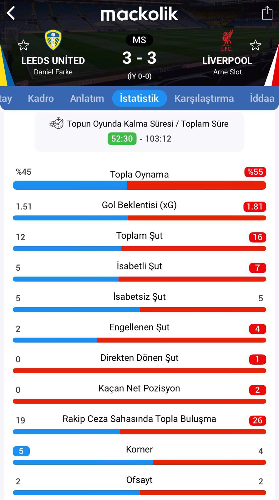 Maçta golleri Leeds United adına 73. dakikada Calvert-Lewin (P), 75. dakikada Stach, 90+6. dakikada Tanaka; İngiliz devi adına 48 ve 50. dakikalarda Ekitike, 80. dakikada Szoboszlai kaydetti.