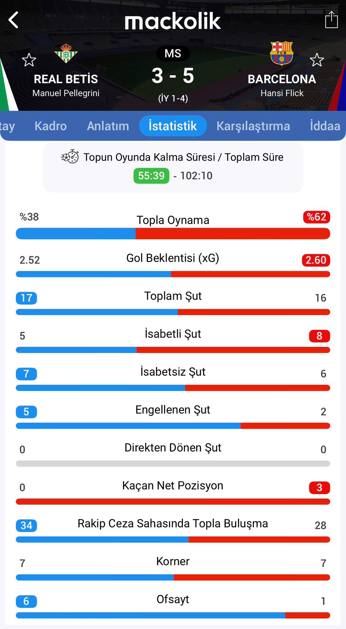 LaLiga'da 13. galibiyetini alan Katalan ekip, 40 puanla lider konumda. Betis ise ligdeki 3. mağlubiyetini alarak 24 puanla 5. sırada yer alıyor.