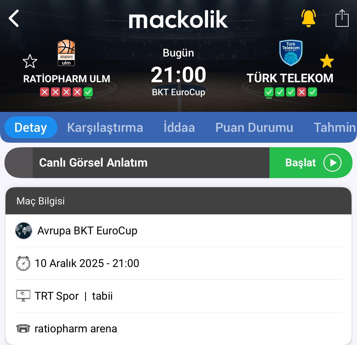 Grupta Türk Telekom 6 galibiyet, 3 mağlubiyetle 3'üncü, Ratiopharm Ulm ise 4 galibiyet, 5 yenilgiyle 7'nci sırada yer alıyor.