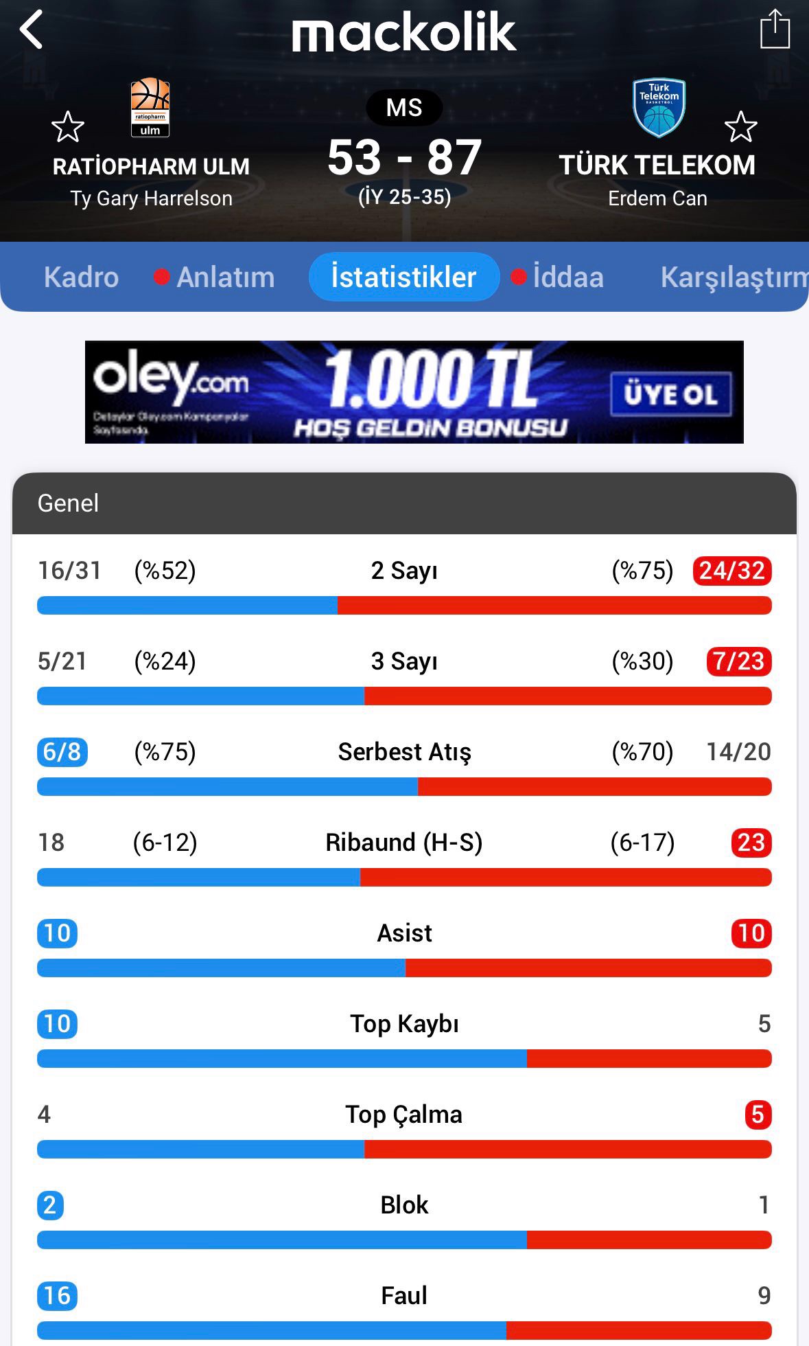 Son periyoda 21 sayı önde giren temsilcimiz parkeden 87-53'lük skorla 34 sayı farkla galip ayrıldı.