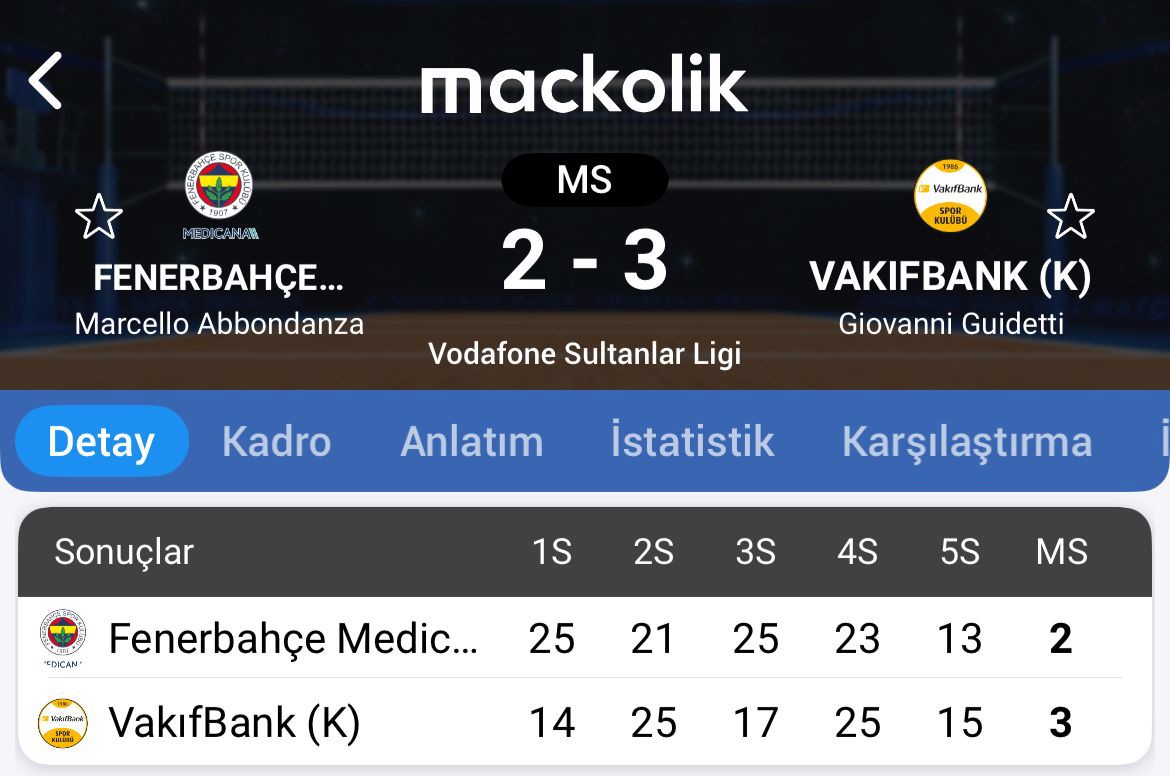 VakıfBank, Vodafone Sultanlar Ligi 10. hafta maçında konuk olduğu Fenerbahçe Medicana'yı 3-2 mağlup etti.