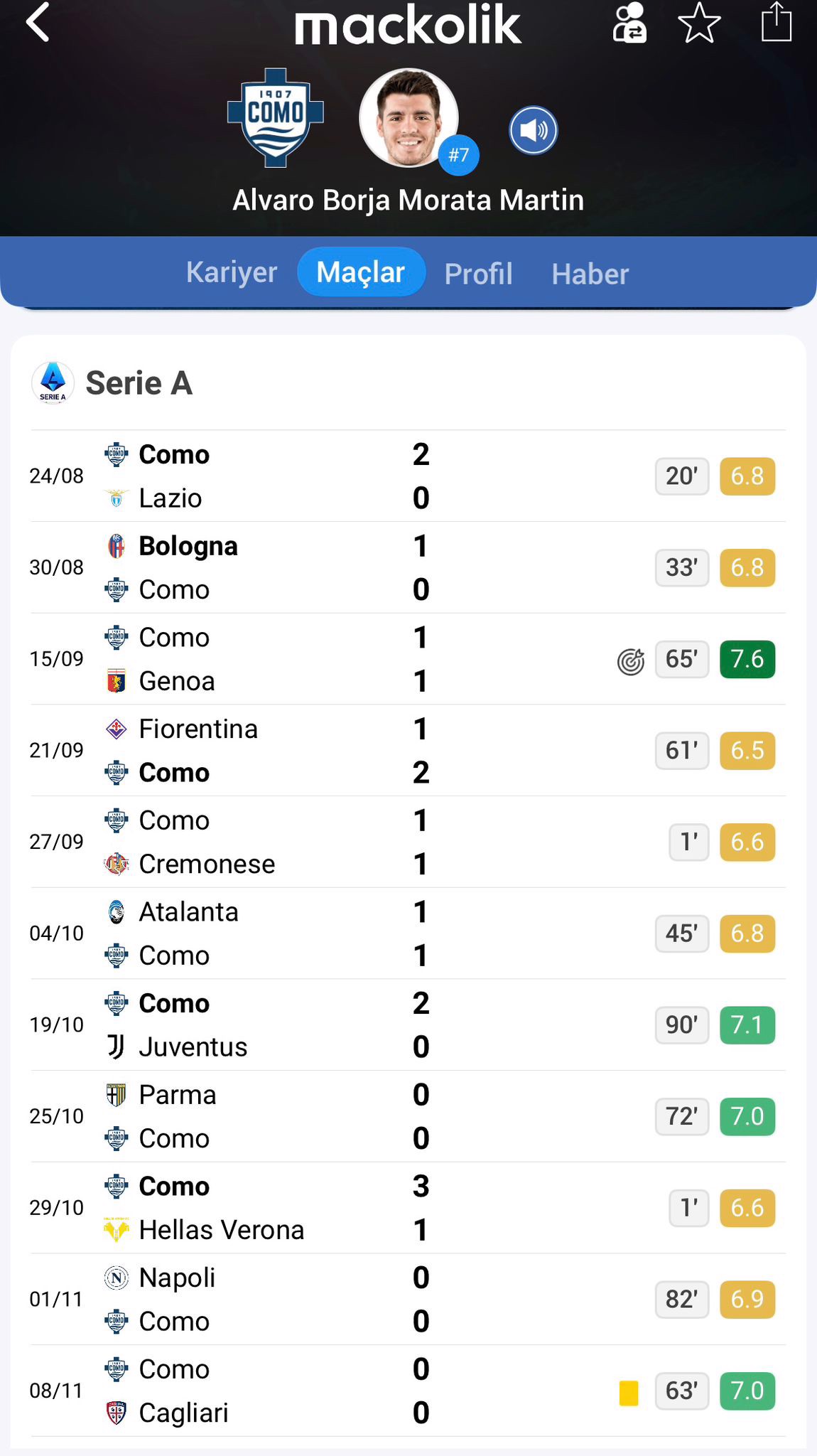Galatasaray'da istediği ivmeyi bulamayan İspanyol oyuncu, Como'da forma giydiği 15 karşılaşmada gol katkısı veremezken yalnızca 1 asist yapabildi.
