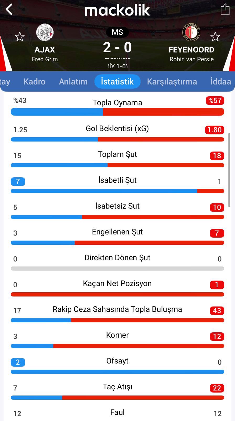 Bu sonuçla Fred Grim'in öğrencileri ligdeki puanını 29 yaparken Robin van Persie'nin öğrencileri 34 puanda kaldı.