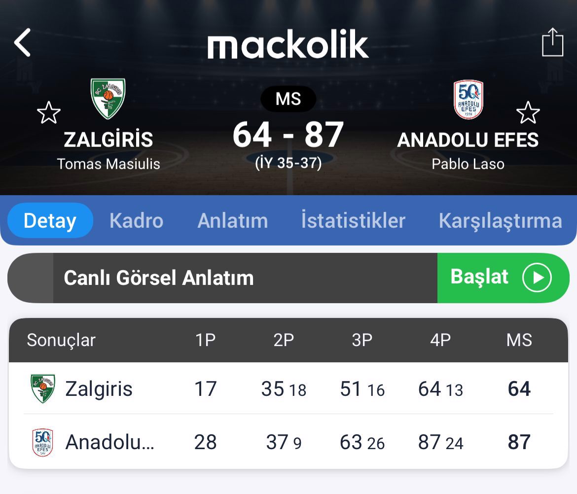 İkinci çeyrekte Zalgiris, 18-9'luk üstünlük kursa da temsilcimiz devre arasına 37-35 önde gitti.