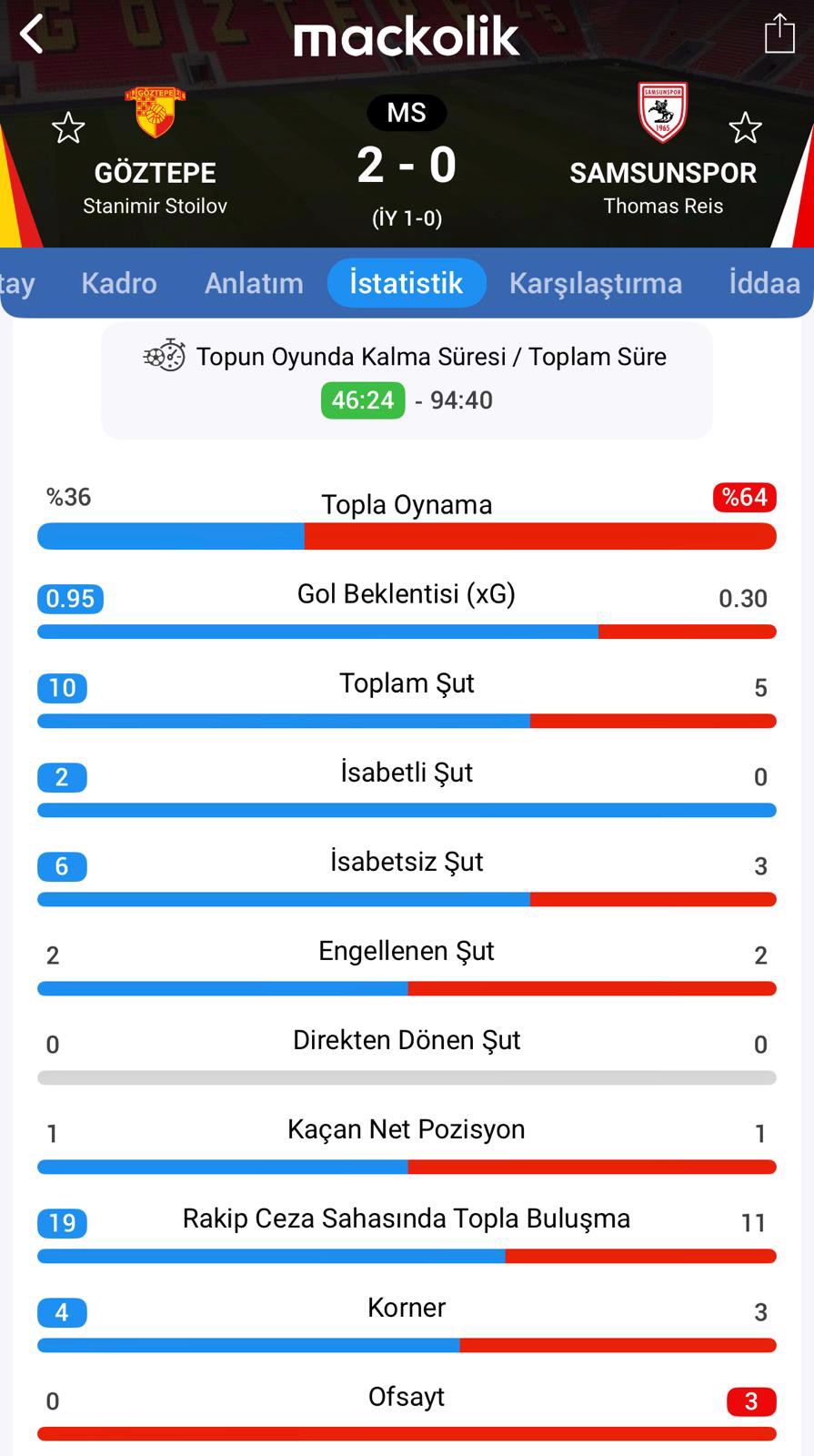 46. dakikada Göztepe gole yaklaştı. Taha Altıkardeş'in sağ kanattan ortasında arka direkte topla buluşan Juan, meşin yuvarlağı ceza sahası içerisindeki Efkan Bekiroğlu'na gönderdi. Efkan Bekiroğlu'nun yakın mesafeden sert şutunda top direğin üstünden auta çıktı.