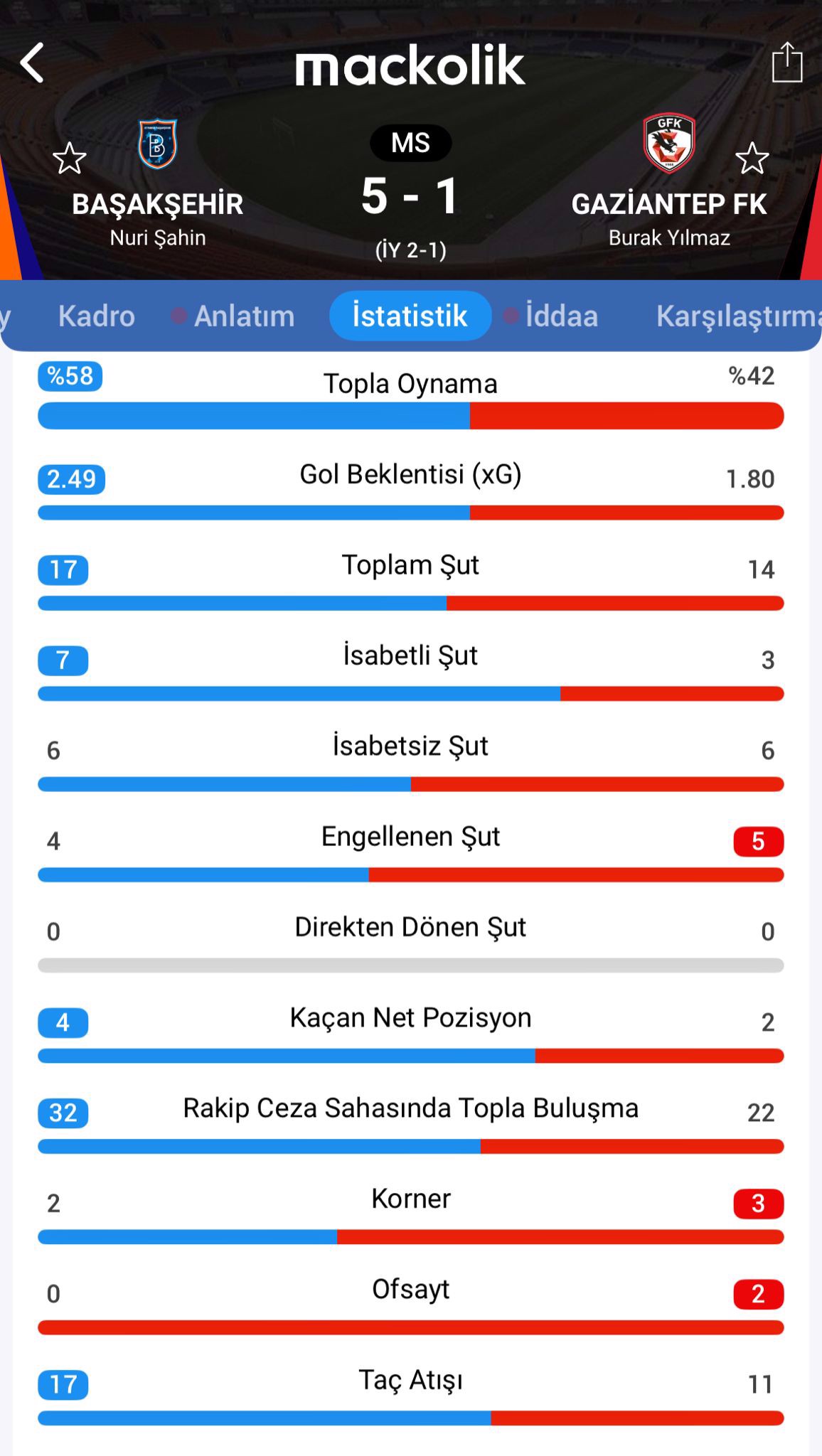 Kalan dakikalarda başka gol olmayınca Başakşehir, Gaziantep FK'yi 5-1 mağlup etti.
