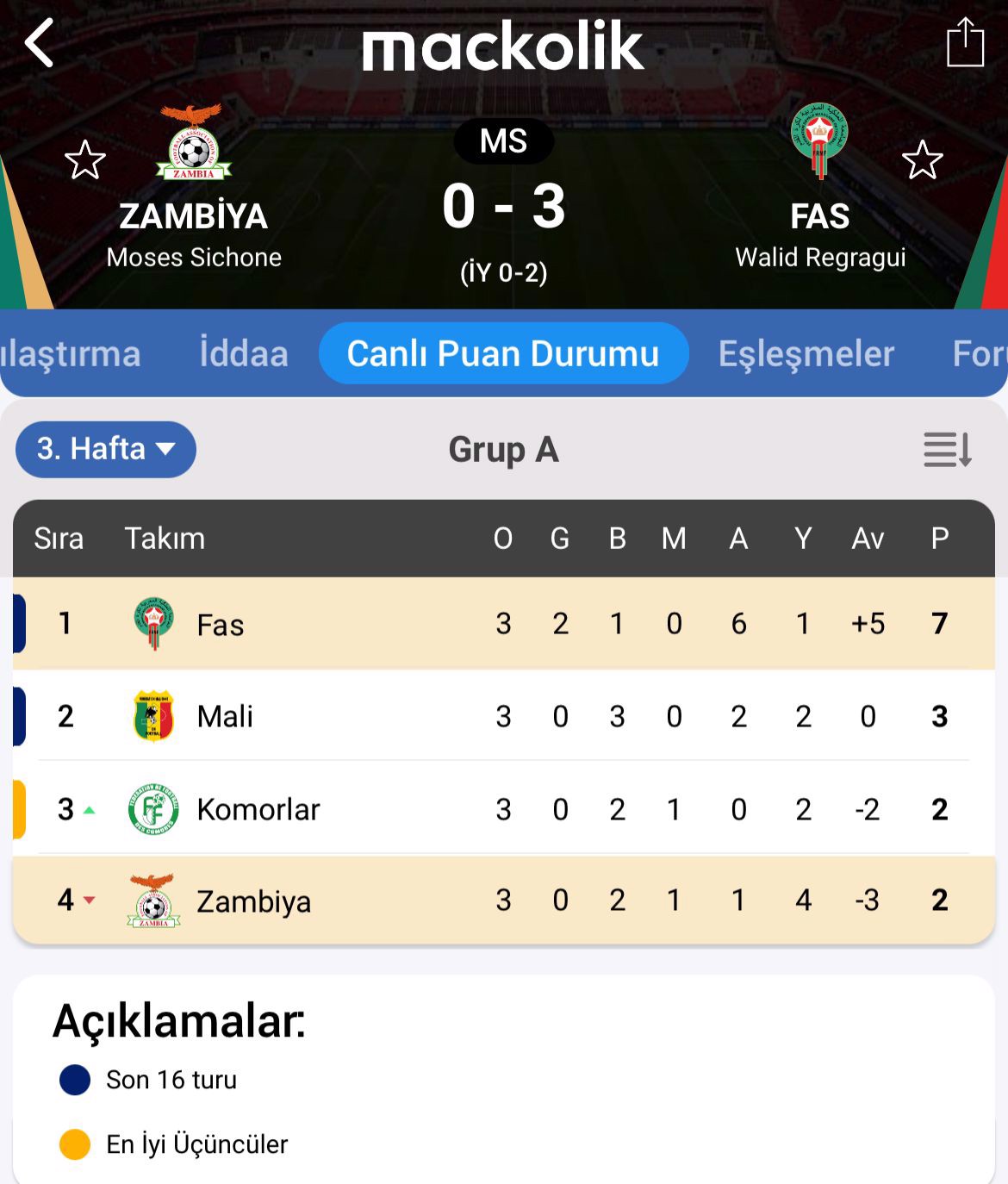 Böylece Fas maçı 3-0 kazandı ve 7 puana yükselerek son 16 turuna adını yazdırdı.