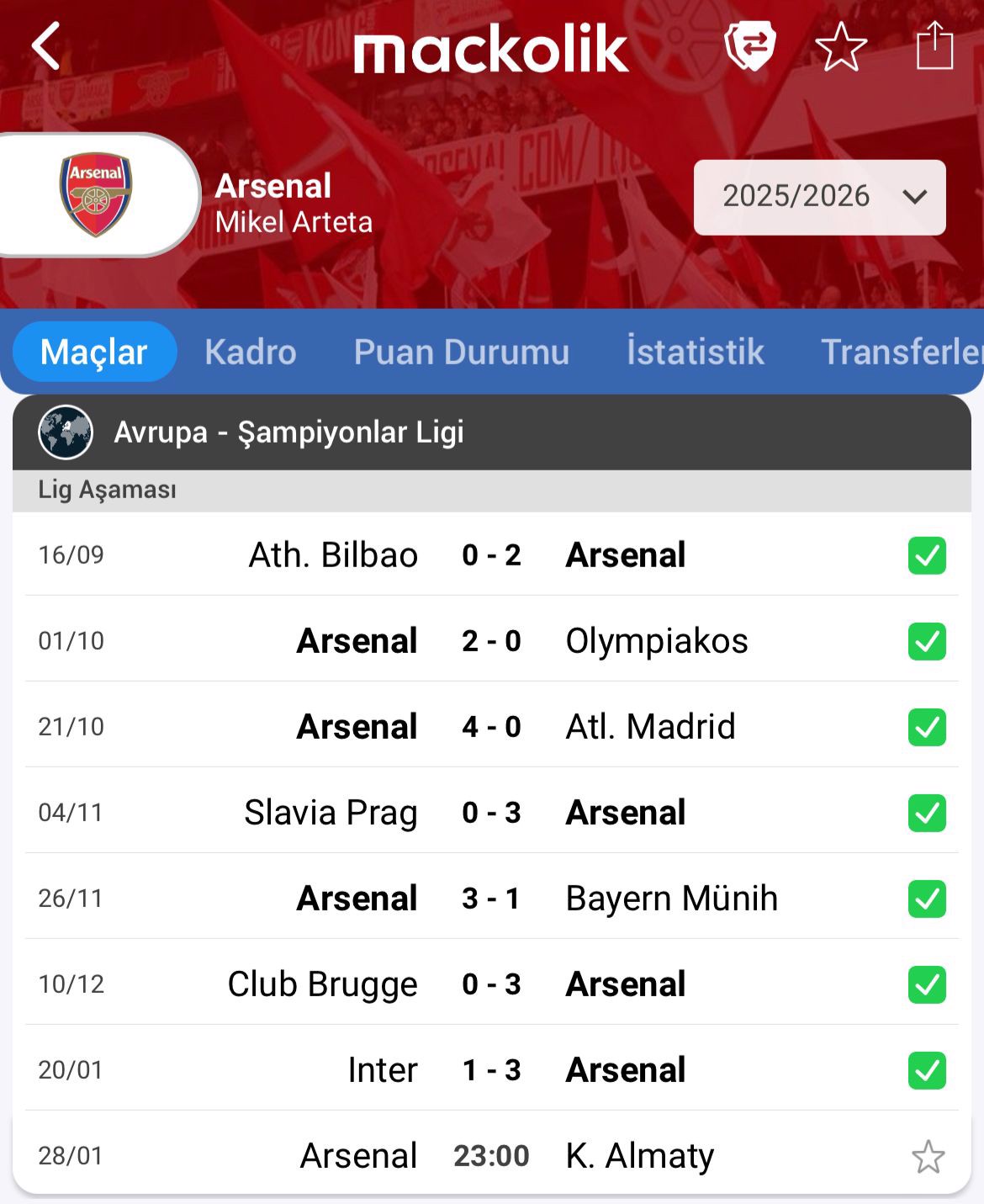 Bu sezon performansıyla göz dolduran Arsenal, Inter zaferiyle birlikte Şampiyonlar Ligi lig aşamasında 7'de 7 yaptı.