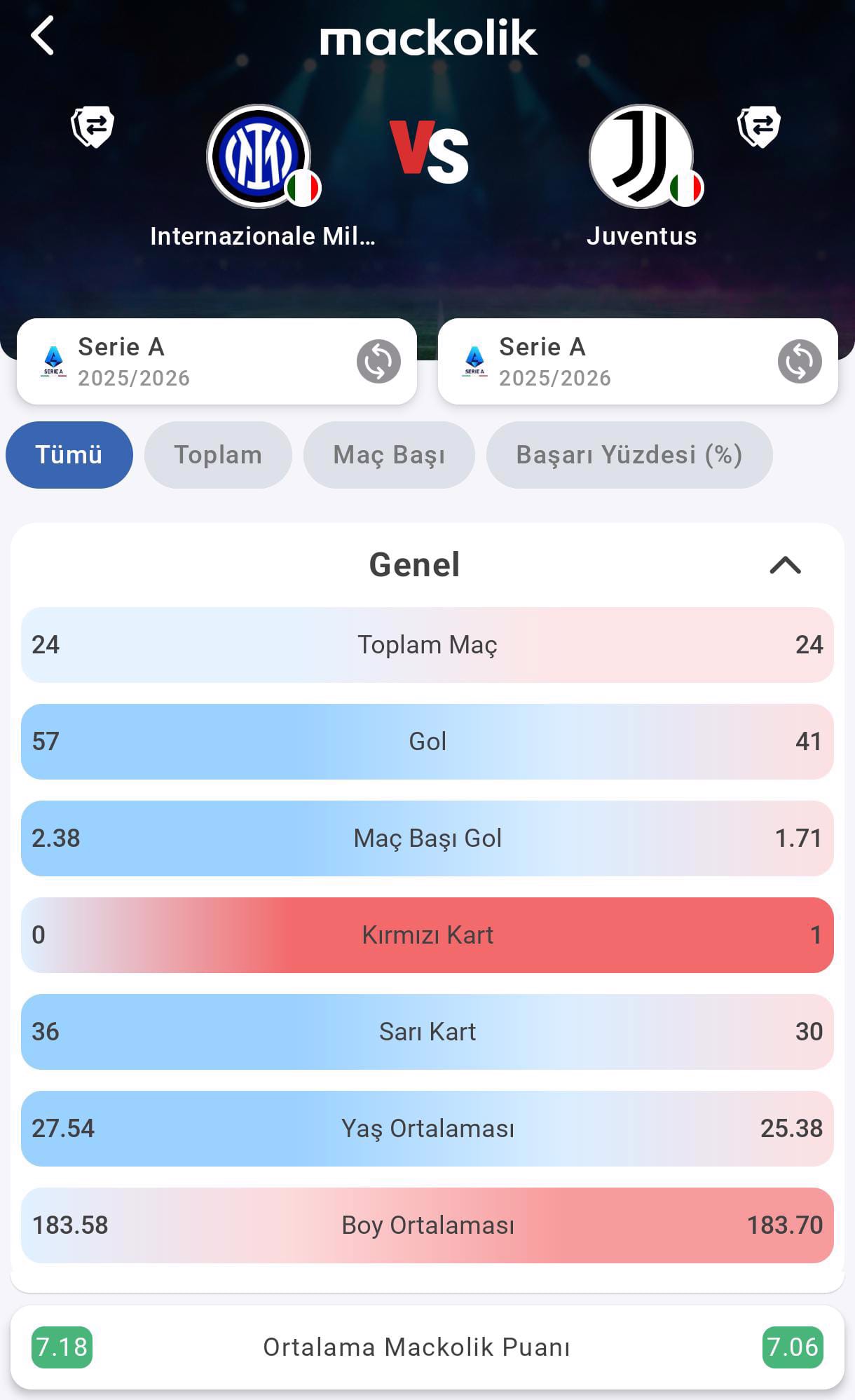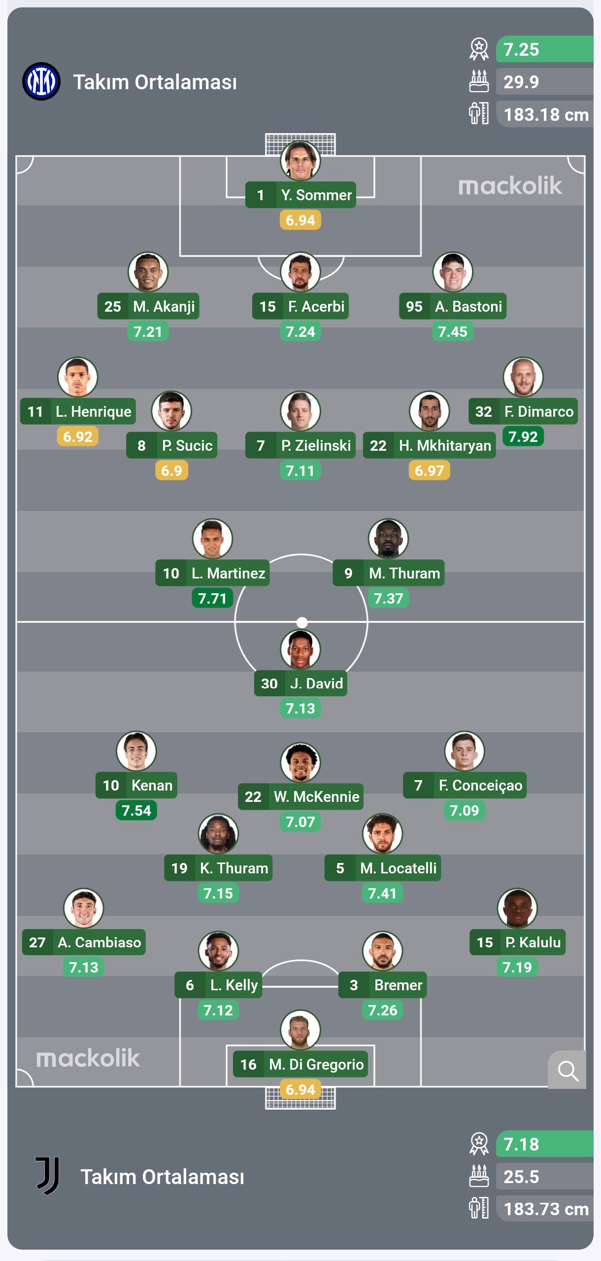 Ortalama performans puanında Inter 7.18 ile Juventus'un (7.06) önünde. Sezon genelinde daha istikrarlı bir görüntü veriyor.